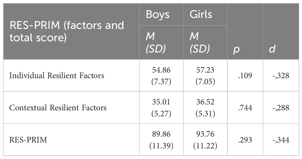 Gender differences in resilience levels were explored using Student’s t-tests. As shown in Table 7, no significant differences were found between boys and girls in the total scale or in individual and contextual resilience factors, suggesting that resilience manifests similarly across both genders within the analyzed sample.