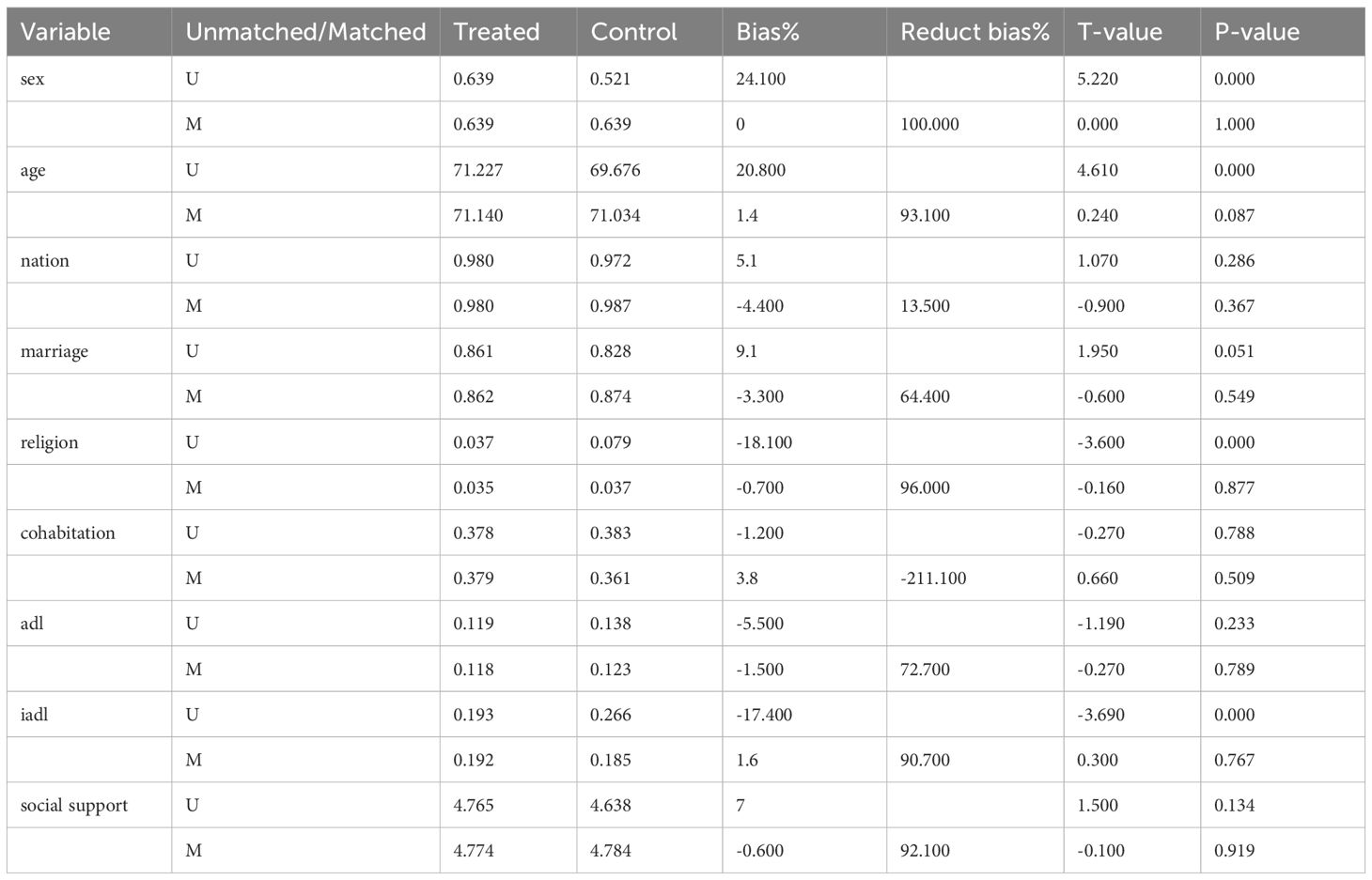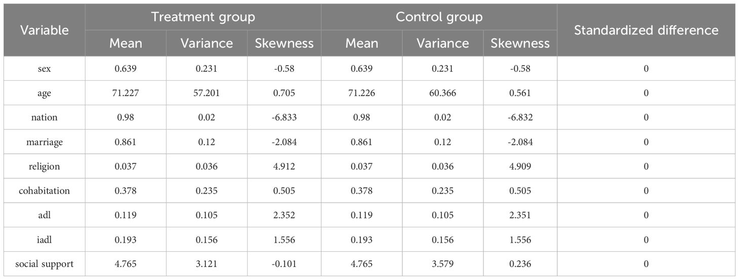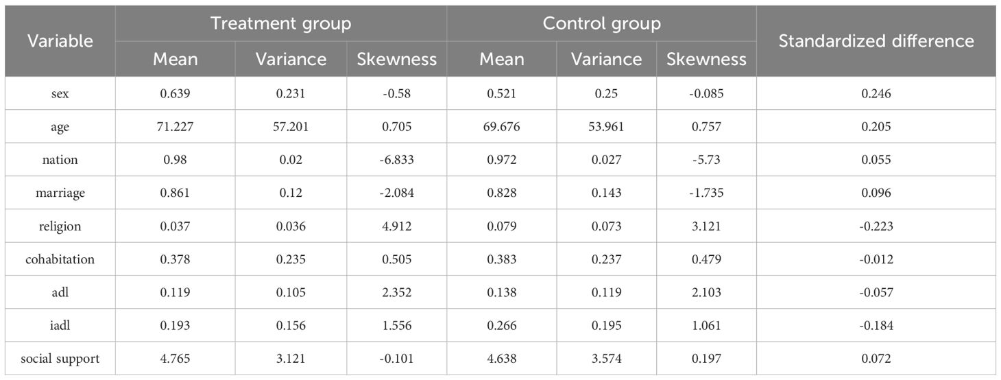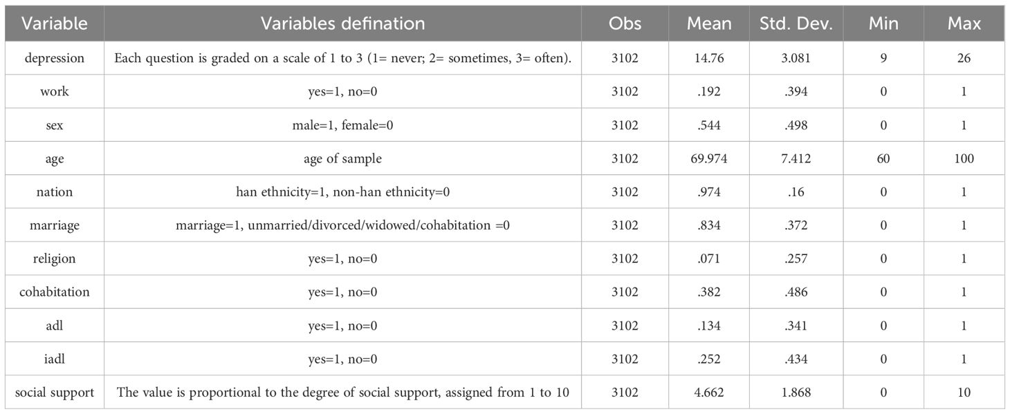 In selecting control variables, this study draws on the work of Wang et al. (43) and includes demographic characteristics such as gender, age, ethnicity, marital status, religious beliefs, and whether living with children. It also incorporates health-related variables, including basic functional ability and ability to perform daily activities, as well as social support, which serves as an indicator of social capital.