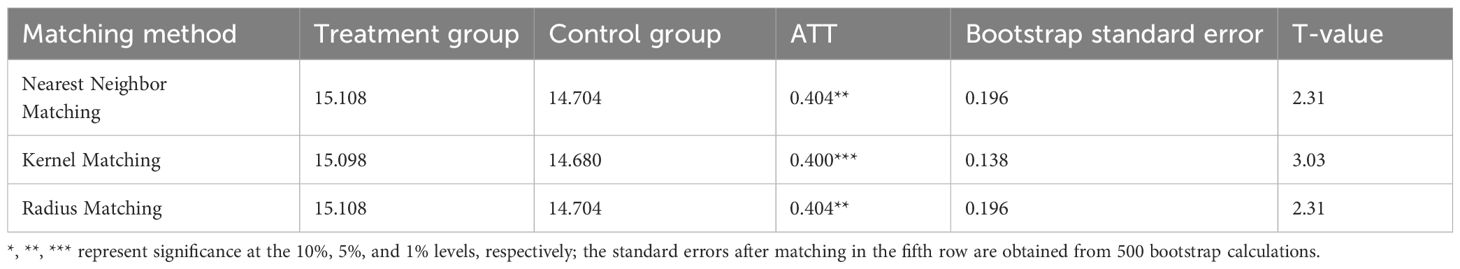 To verify the robustness of the baseline regression, this study further employed the entropy balancing method (Entropy Balancing), which is considered more accurate for handling high-dimensional data. This method, first proposed and applied by Hainmueller (46), assigns optimal weights to covariates by constraining the first, second, and third moments of the covariates in the treatment and control groups to achieve balance. In doing so, the weighted distributions of the treatment and control groups are made as similar as possible, thereby attaining exact matching. A simple regression is then conducted on the matched sample, and the coefficient of the explanatory variable represents the average treatment effect.