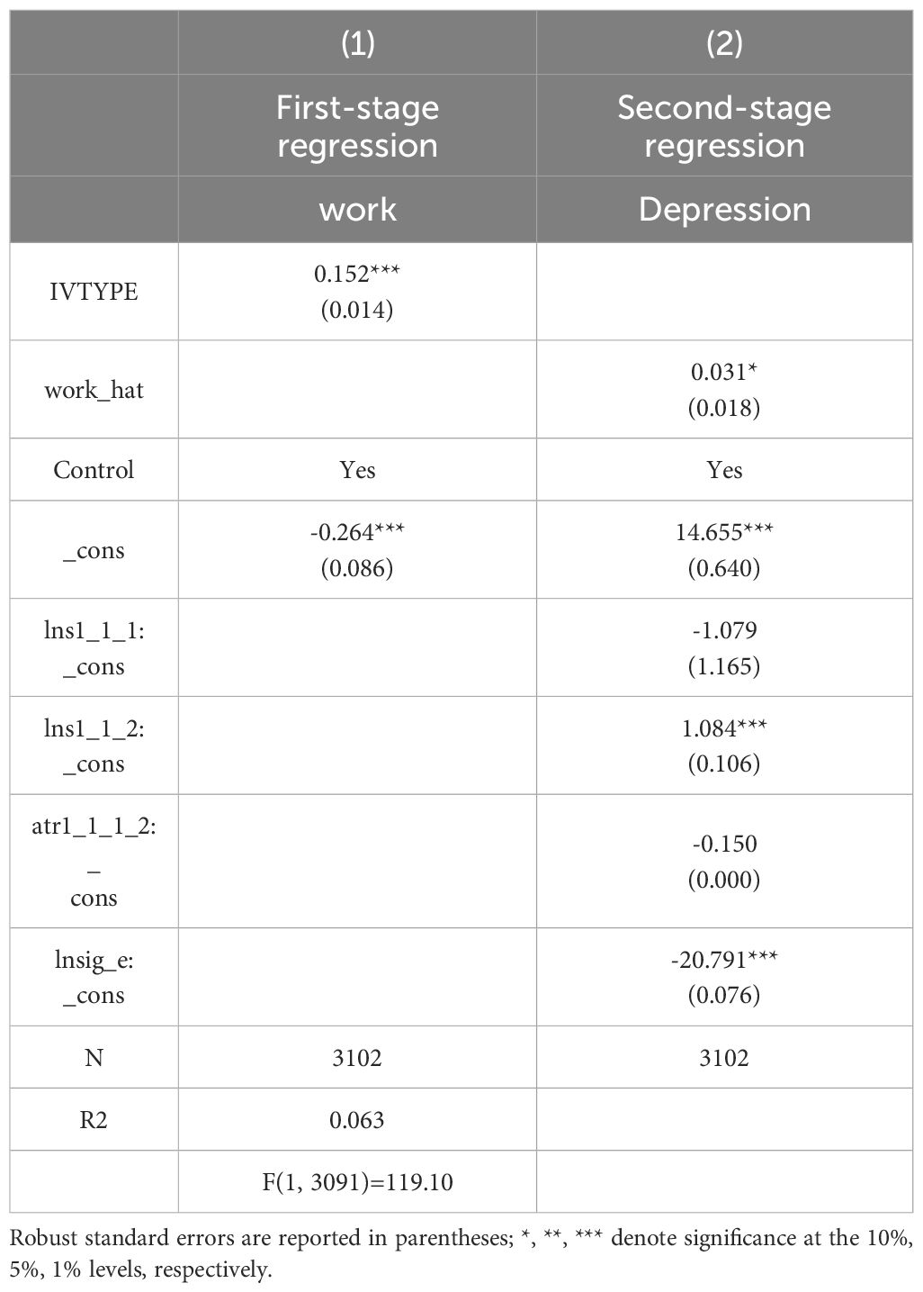 To evaluate the robustness of the association between retired work-unit identity and depression, this study employs “whether the pre-retirement employer belonged to the public sector” as an instrumental variable to address potential endogeneity. This variable satisfies both the relevance and exogeneity conditions.