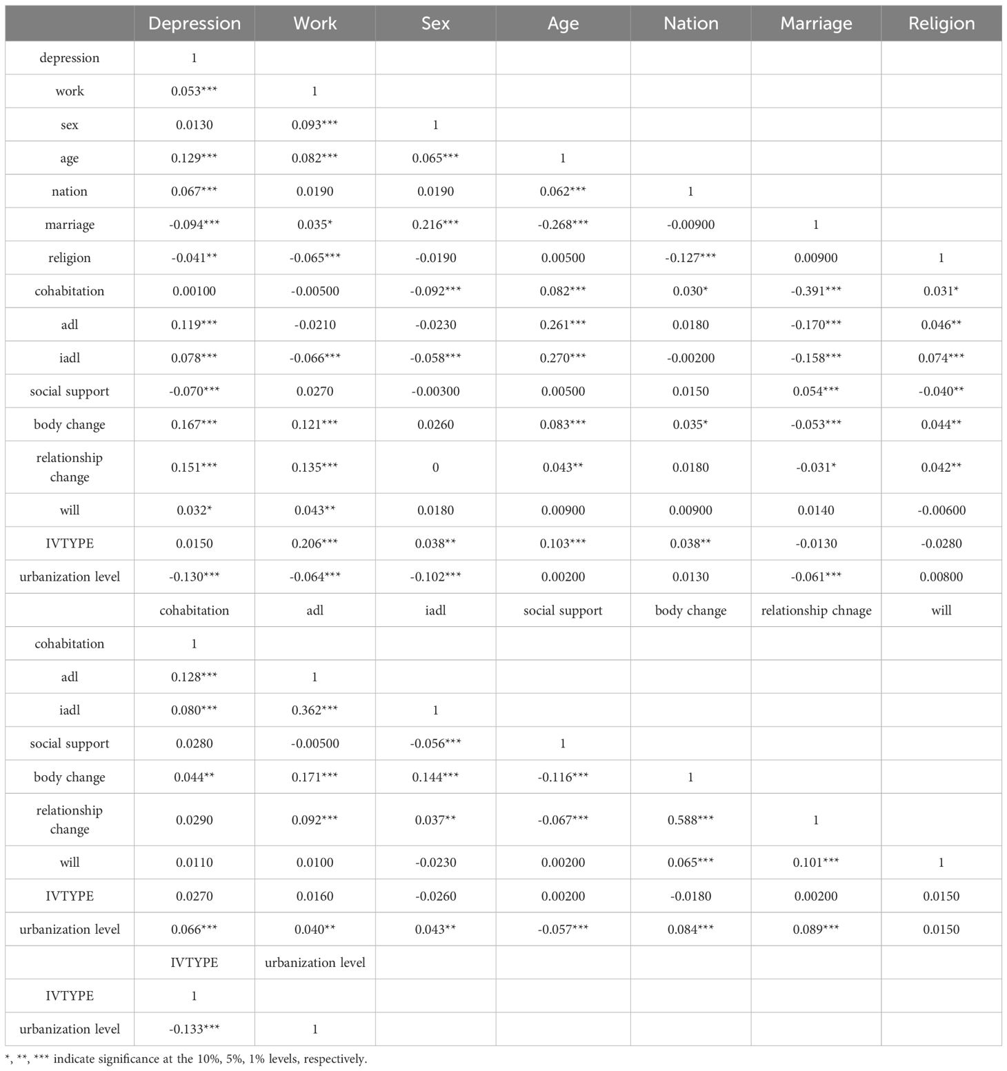 To verify whether “willingness to participate in social activities” and depression represent distinct constructs, we followed the approach of Obilor and Amadi (48) and conducted correlation tests among all variables using the Pearson correlation coefficient (r). Table 11 presents the full correlation matrix. The results show that the correlation coefficient between “willingness to participate in social activities” and depression was only 0.032 (although statistically significant, the effect size was extremely small), indicating that there is virtually no substantive linear correlation between the two variables (49).
