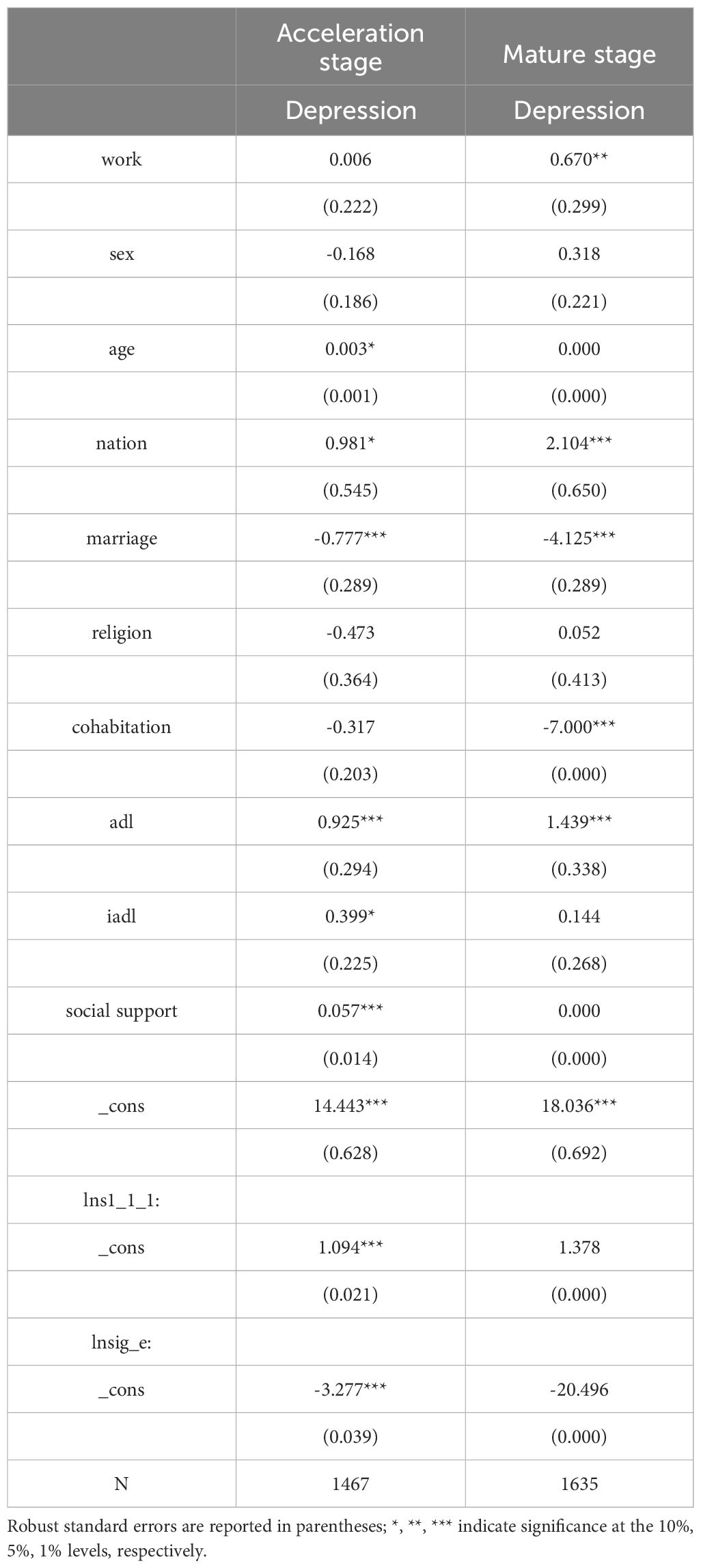 Regional disparities largely shape older adults’ health status and access to social resources (50). Accordingly, this study conducted a heterogeneity analysis based on the level of urbanization at the prefecture-city level to examine how regional development influences the depressive symptoms of retired Danwei leaders. Drawing on Northam’s (1979) “S-curve” framework of urbanization, the sample was divided into the acceleration stage (30% ≤ urbanization rate < 70%) and the mature stage (urbanization rate ≥ 70%) for separate estimations. The results reported in Table 13 show that the negative effect of retirement on depression among Danwei leaders was significant only in the mature stage of urbanization. This indicates that retired Danwei leaders in highly urbanized areas exhibit significantly higher levels of depression.