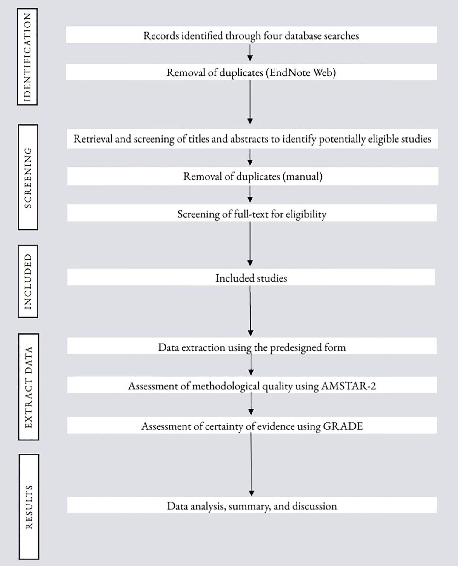 Search results retrieved from the five databases will be exported to EndNote Web for sorting and automatic de-duplication, then exported to Rayyan (24) for manual de-duplication and blinded screening. Titles and abstracts of remaining studies will be screened for a first assessment against eligibility criteria, followed by full-texts evaluation.