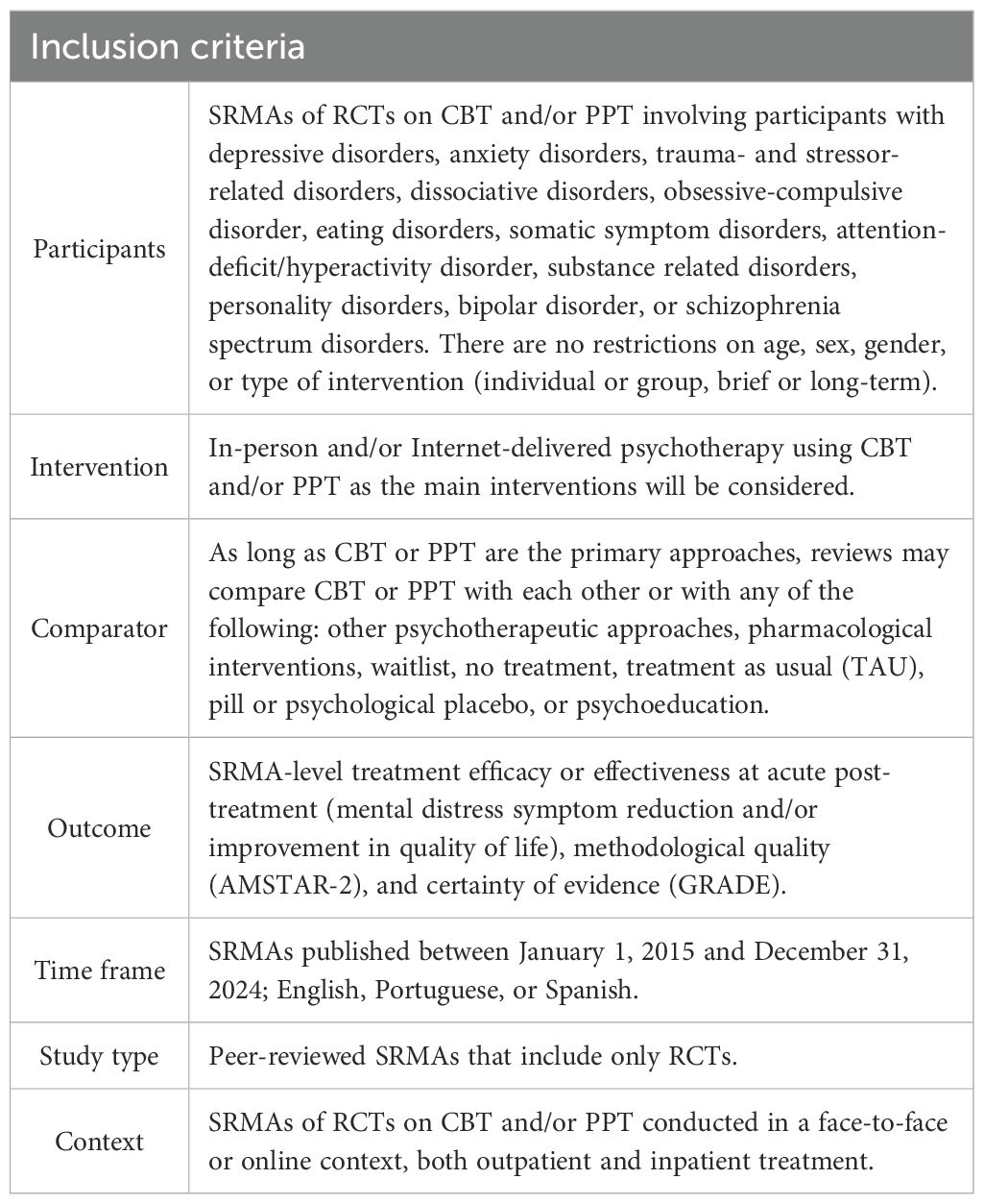 (i) Systematic reviews that do not assess treatment efficacy or effectiveness; (ii) systematic reviews without meta-analyses; (iii) SRMAs that do not focus on CBT or PPT; (iv) SRMAs that include non-randomized designs; (v) SRMAs of RCTs of interventions using solely artificial intelligence interventions and/or mobile health tools; (vi) SRMAs published in languages other than English, Portuguese, or Spanish (language restriction will be acknowledged as a limitation); and (vii) book chapters, dissertation, and thesis.