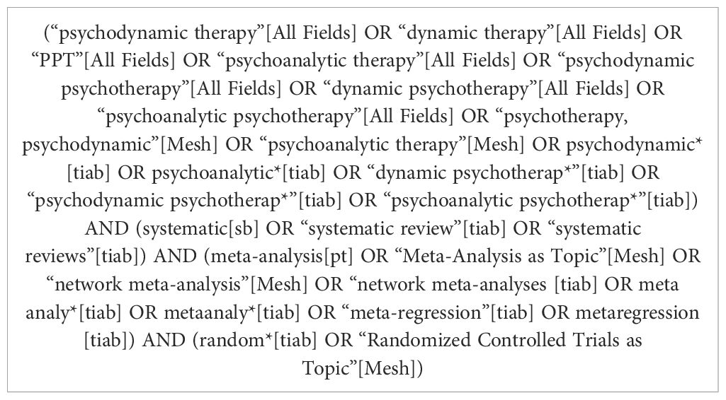 Searches will be conducted in The Cochrane Library, PsycINFO, PubMed, Embase, and Web of Science using validated systematic reviews filters (e.g., ISSG), terms for meta-analysis, and controlled vocabulary (MeSH where applicable). Tables 2 and 3 present PubMed-specific strings. Equivalent strategies were translated and adapted for each database (e.g., controlled vocabulary and operators) to ensure functional equivalence. We will restrict inclusion to articles published from 2015 onward to ensure comparability under current evidence-based synthesis standards and contemporary psychotherapy delivery. From 2015, core guidance became available and widely adopted, for example, PRISMA for protocol reporting (22), and AMSTAR-2 for review quality. Reviews before this timeframe might not have pre-registered protocols or used these tools, which would systematically disadvantage older reviews for historical–and not methodological–reasons, and compromise the present study. This time window also captures the maturation and scale-up of Internet-delivered psychotherapy and updated diagnostic, as well as clinical frameworks (e.g., post-DSM-5), aligning included evidence with contemporary practice and outcomes.