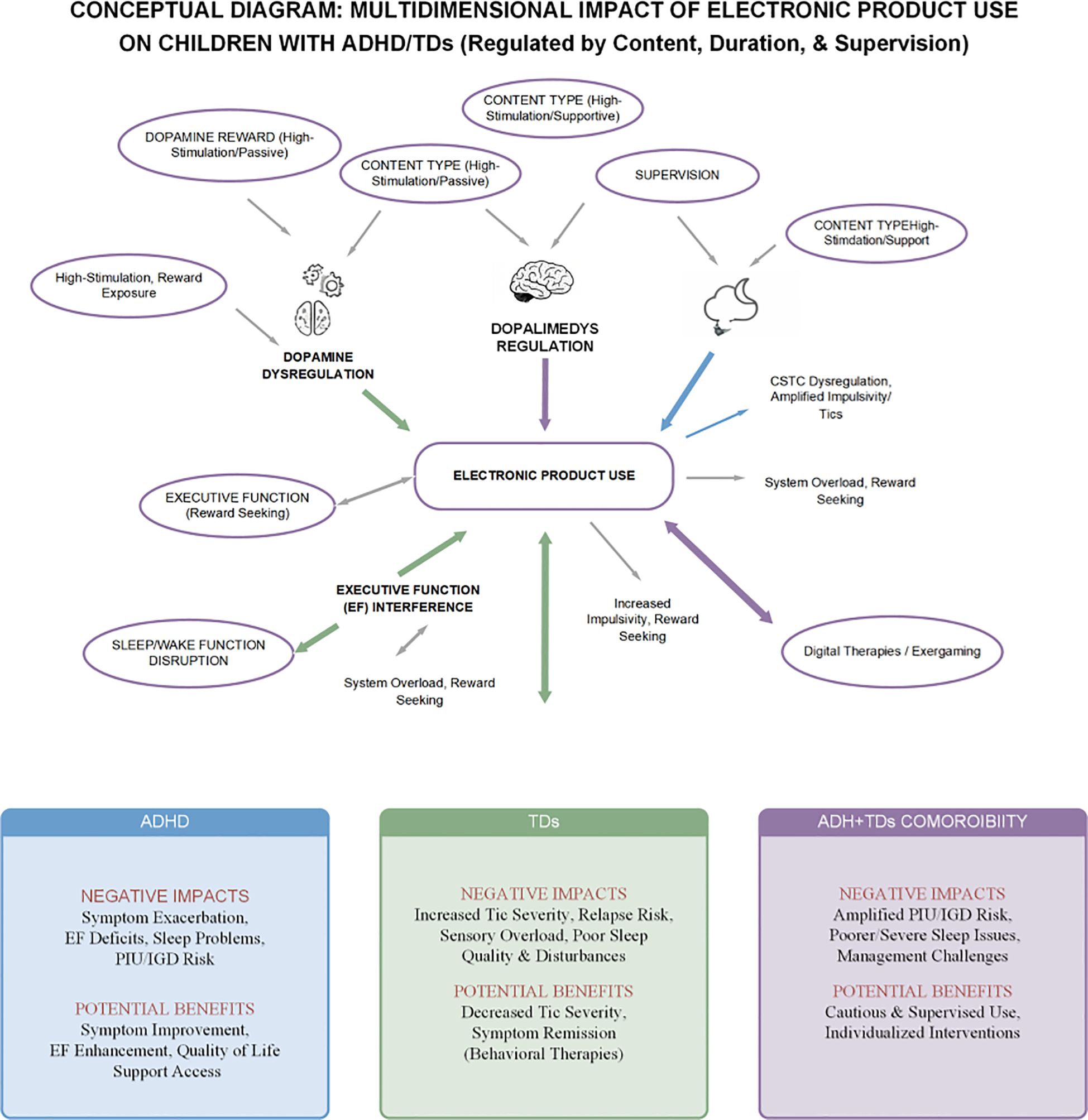 To achieve these aims, this review draws upon an extensive synthesis of literature primarily sourced from the PubMed database, supplemented by key theoretical papers and influential reviews in the field. This review will also specifically note how the included studies address comorbidity, indicating whether children with co-occurring ADHD and TDs are analyzed as a distinct subgroup. The literature selection prioritized high-quality research and significant contributions relevant to understanding the complex interplay between electronic product use and neurodevelopmental outcomes in children with ADHD and TDs, as well as those exploring effective impact mechanisms and management strategies. This diverse body of knowledge is synthesized herein to offer a comprehensive overview, identify critical gaps, and propose a novel framework for guidance.