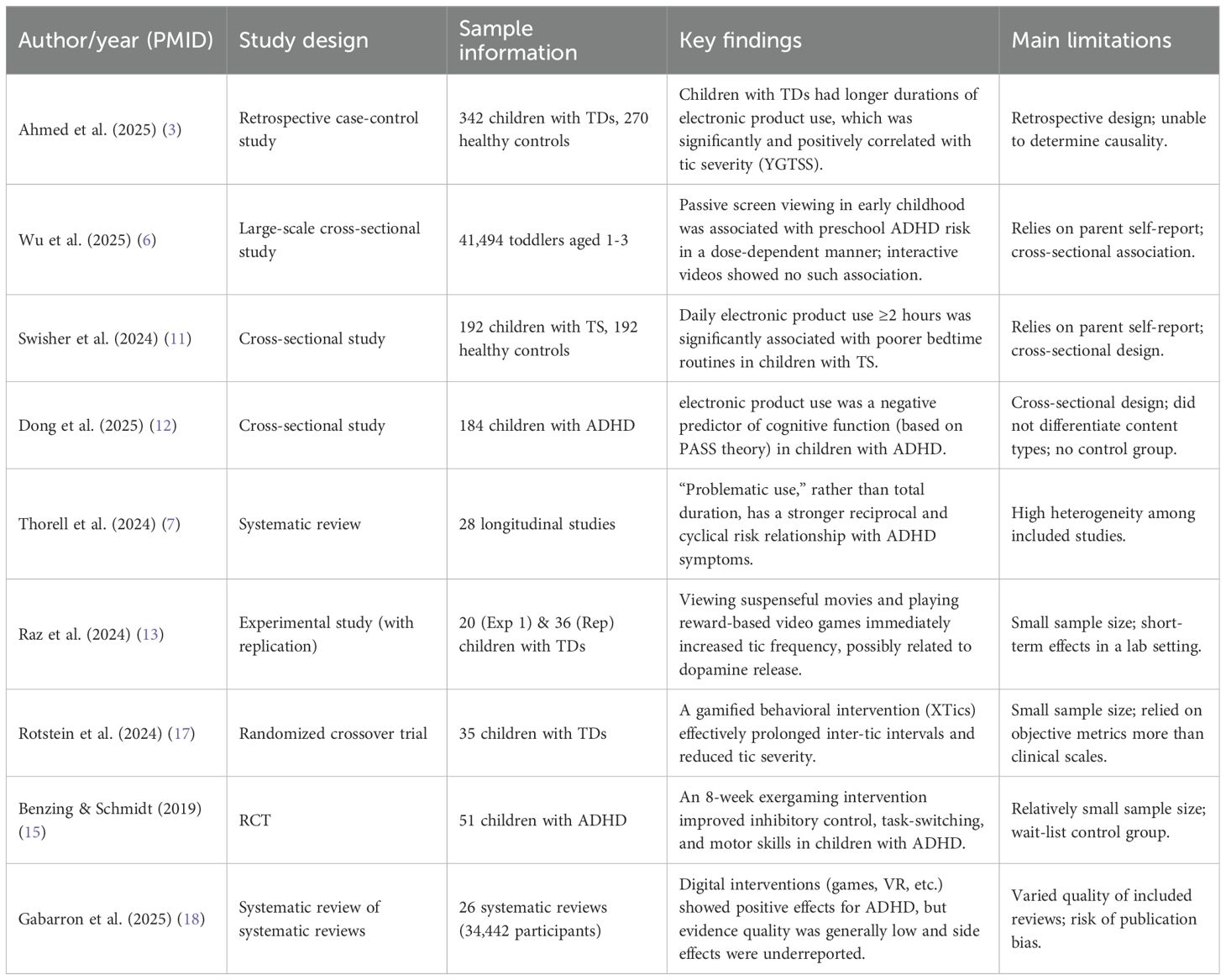 The rapid development of the digital information age has made electronic screens an indispensable part of learning, entertainment, and socialization for children and adolescents. However, this popularization is accompanied by growing concerns about potential health impacts, particularly for vulnerable groups during neurodevelopment, such as children with ADHD and TDs. ADHD, characterized by persistent inattention and/or hyperactivity-impulsivity, affects approximately 5-7% of school-aged children globally. TDs manifest as recurrent, involuntary motor or vocal tics, with TS being the most complex form, affecting about 0.3-1% of the population (19). These disorders not only cause learning difficulties, social impairments, and emotional distress for the affected children but also place a heavy burden on families and society. Against this backdrop, exploring the impact of electronic product use on children with ADHD and TDs holds significant practical importance. Current clinical practice often leans towards strict limitation or even prohibition of electronic product use for these children, based mainly on general concerns and scattered observations, lacking systematic evidence and detailed guidelines. Such a “one-size-fits-all” approach may not only be difficult to enforce but also overlook the potential positive roles of electronic products in education, cognitive training (e.g., serious games designed for ADHD (15, 20), and social connection. Therefore, a scientific and comprehensive assessment of the risks and potential benefits of electronic product use, along with clarification of its impact mechanisms, extent, and reasonable management strategies, is of crucial theoretical value and clinical guidance for optimizing comprehensive intervention plans, improving quality of life, and promoting healthy development in children with ADHD and TDs.