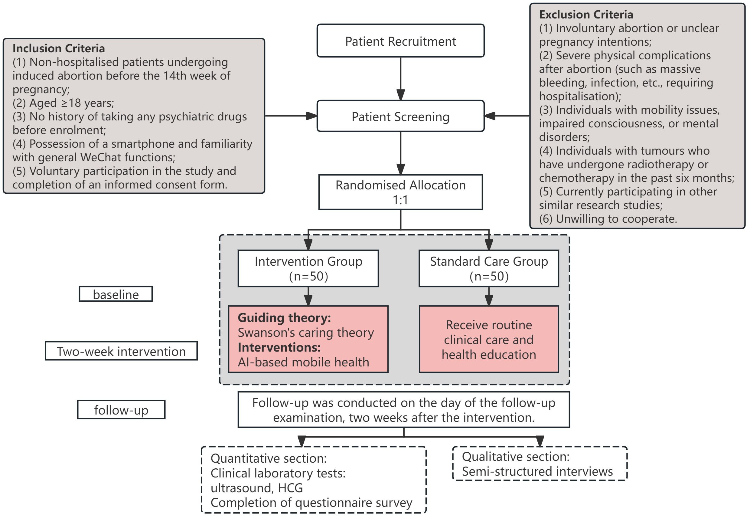 The study will use a mixed-methods study design and will be conducted at the Inner Mongolia Maternity and Child Health Care Hospital from 2025 to 2026. A randomized controlled trial with two parallel groups will compare the effectiveness of an Artificial Intelligence-Empowered Mobile Health intervention guided by Swanson’s Theory of Caring on psychological distress (such as depression, anxiety, and stress) in women after abortion. The intervention will last for two weeks, with participants undergoing questionnaires, physical examinations, and individual interviews at baseline and at two weeks to explore changes in psychological distress. The study flowchart is shown in Figure 1.