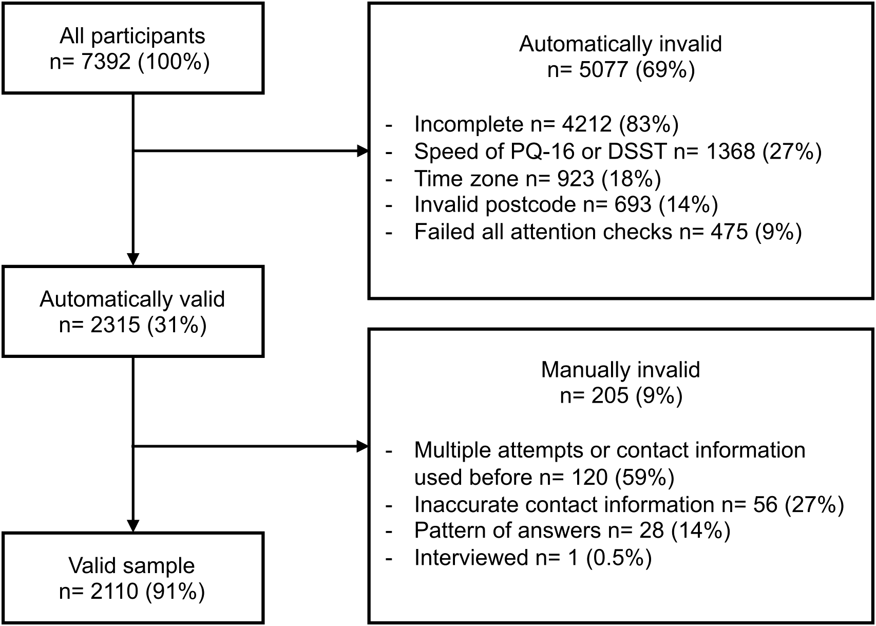 The UK screener received 4,105 entries via the Glasgow site and 3,261 entries via the London site; 26 entries did not reach the question asking where they were recruited from. The ratio of valid to invalid entries was around 2:5 (Figure 2) (see Supplementary Material). The most common reason for the entries being excluded (83%) was that they were significantly incomplete (i.e., had not finished the DSST). A substantial number of entries (27%) were also ruled out due to completing the PQ-16 or DSST faster than it would be possible to make a considered decision. This may have been due to bots or people speeding through the screener. After data cleaning, the valid UK sample consisted of 2,110 entries.