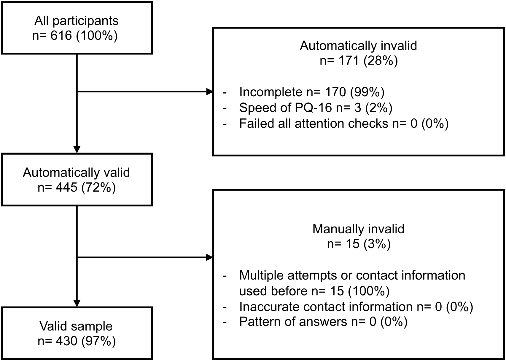 The proportion of participants scoring ≥6 on the PQ-16 is consistent with the findings from other European studies in the general population and in outpatient mental health settings. The procedures and sample characteristics reported here provide context for further analyses using the ENTER tool. In addition, the findings highlight the considerable challenge of fraudulent and inauthentic responses in online research—an issue that may have been amplified by the use of financial incentives and recruitment via social media.