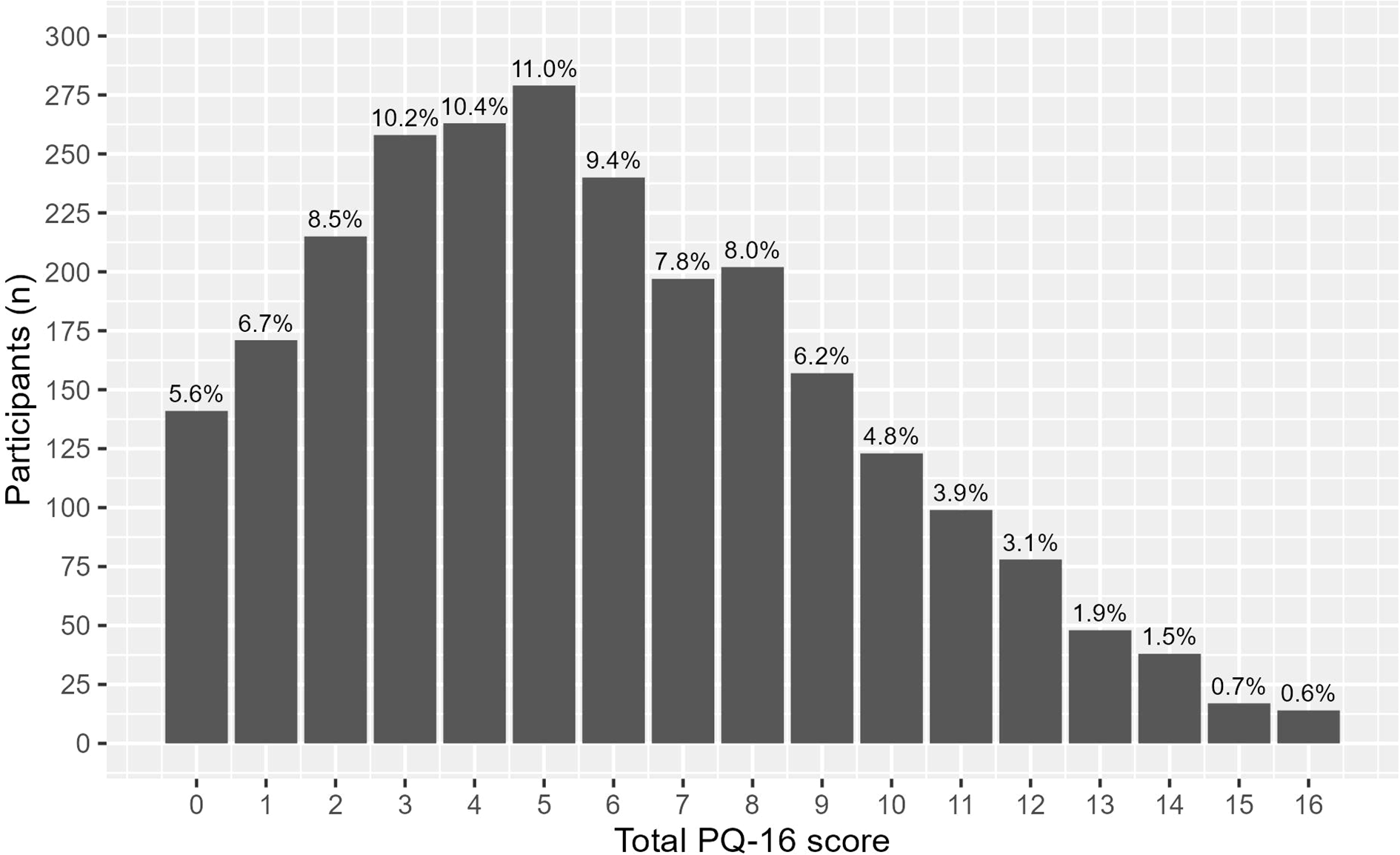 In the general population, the Cronbach’s alpha for the total score on the PQ-16 has been found to be 0.774 (31).
