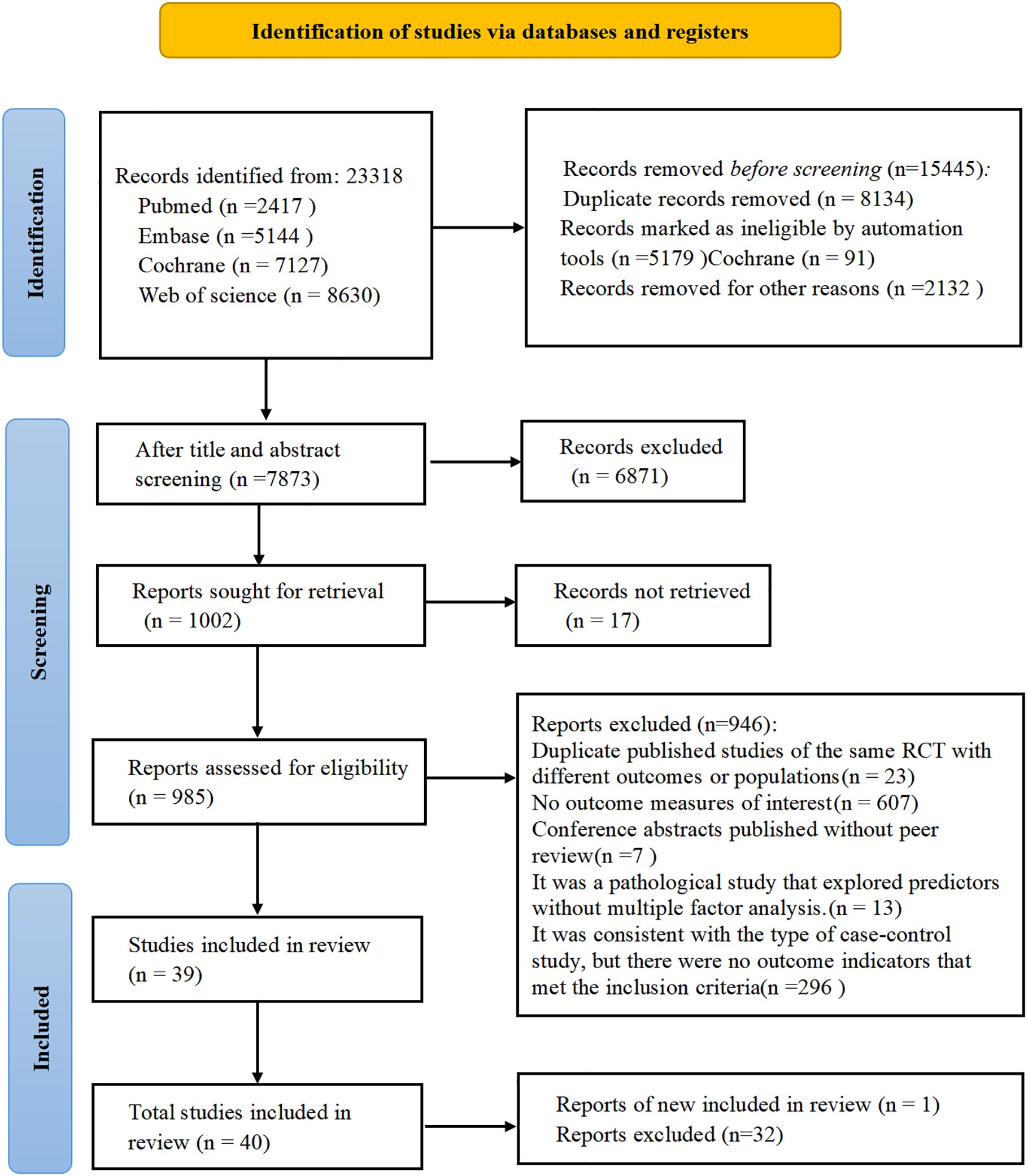 A total of 23,351 records were retrieved from PubMed, EMBASE, Web of Science, and the Cochrane Library. After removing duplicates and screening for eligibility, 40 studies (11, 21–59) met the inclusion criteria and demonstrated adequate methodological quality (Figure 1).