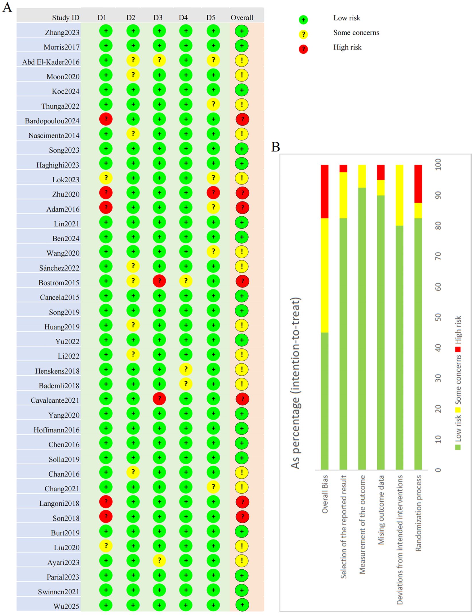 Two reviewers (SGY and DXY) independently assessed the risk of bias using the Cochrane Risk of Bias Tool version 2.0 (RoB 2.0) (20). Five domains were evaluated: randomization process, deviations from intended interventions, missing outcome data, outcome measurement, and selective reporting. Corresponding authors were contacted for missing data. Studies with unobtainable valid data were excluded. Studies were rated as having low risk, some concerns, or high risk of bias, and any discrepancies were addressed through discussion.