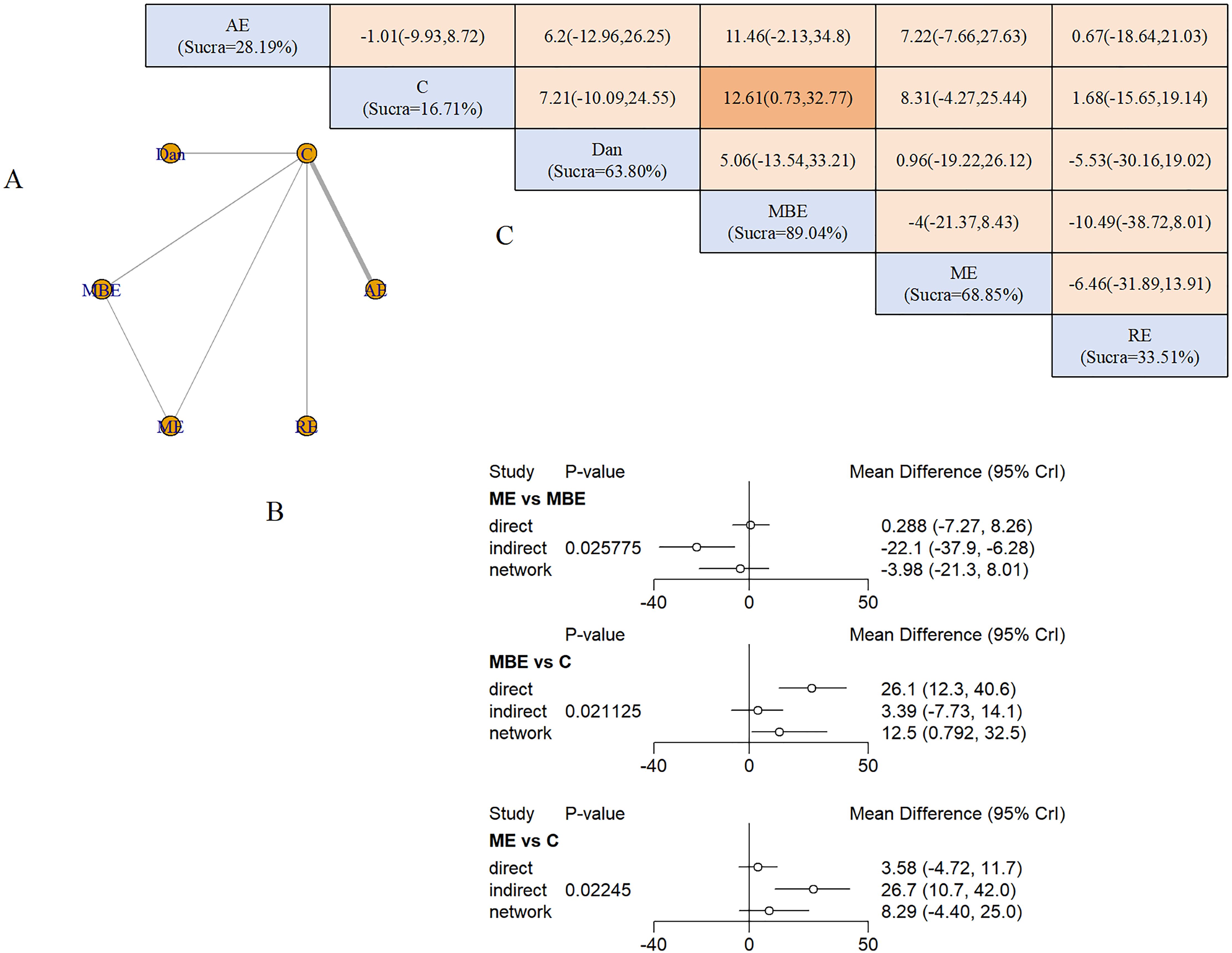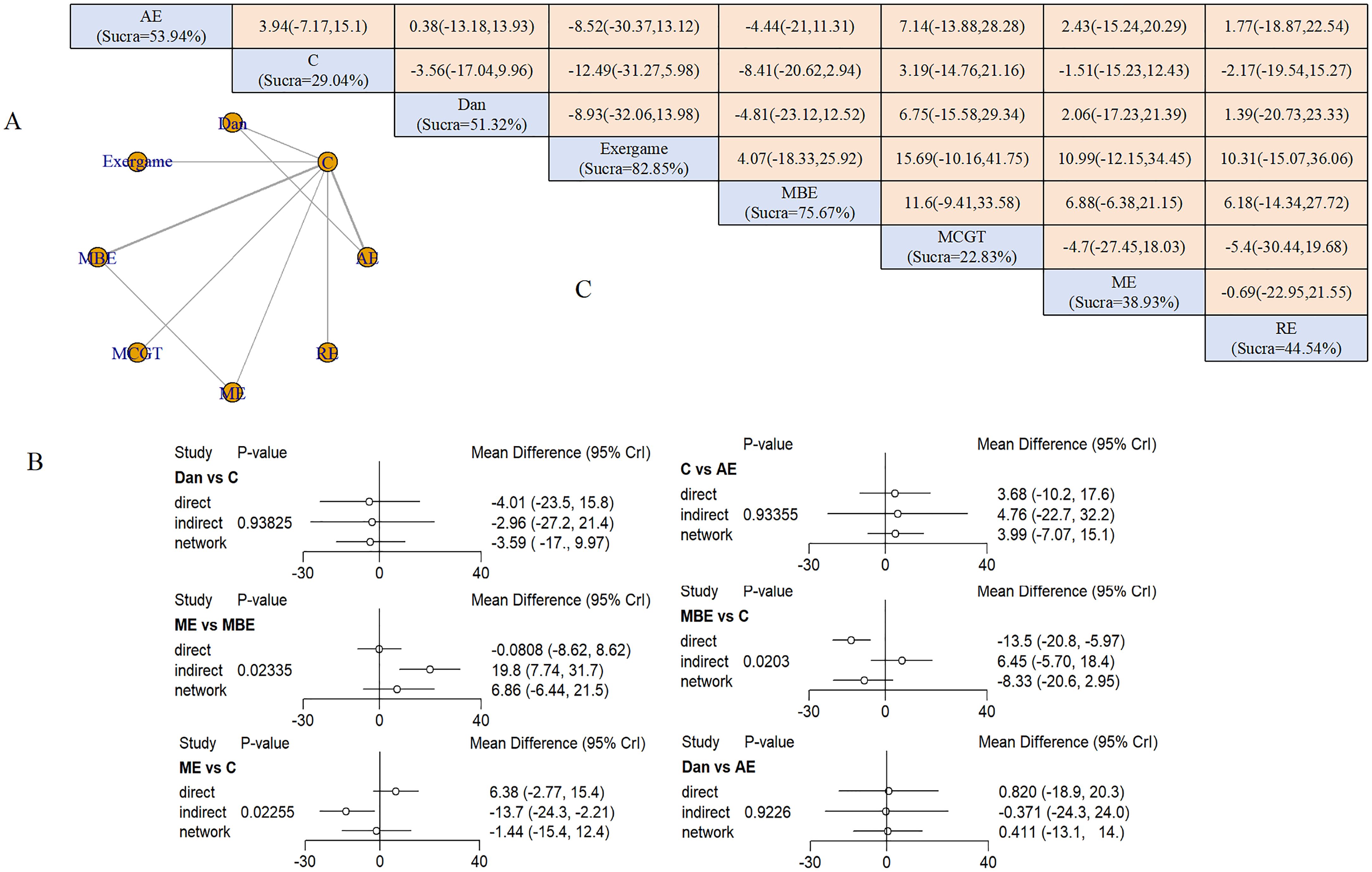 Six interventions formed a network with two closed loops (Figure 4A). AE and MBE represented the largest sample sizes. Node-splitting analysis detected inconsistencies between ME and MBE (P = 0.02), ME and control (P = 0.02), and MBE and control (P = 0.02), indicating potential heterogeneity in these comparisons (Figure 4B). No intervention achieved statistical significance in direct comparisons. SUCRA values ranked exergaming highest (82.85%), followed by MBE (75.67%) and dance (51.32%) (Figure 4C).
