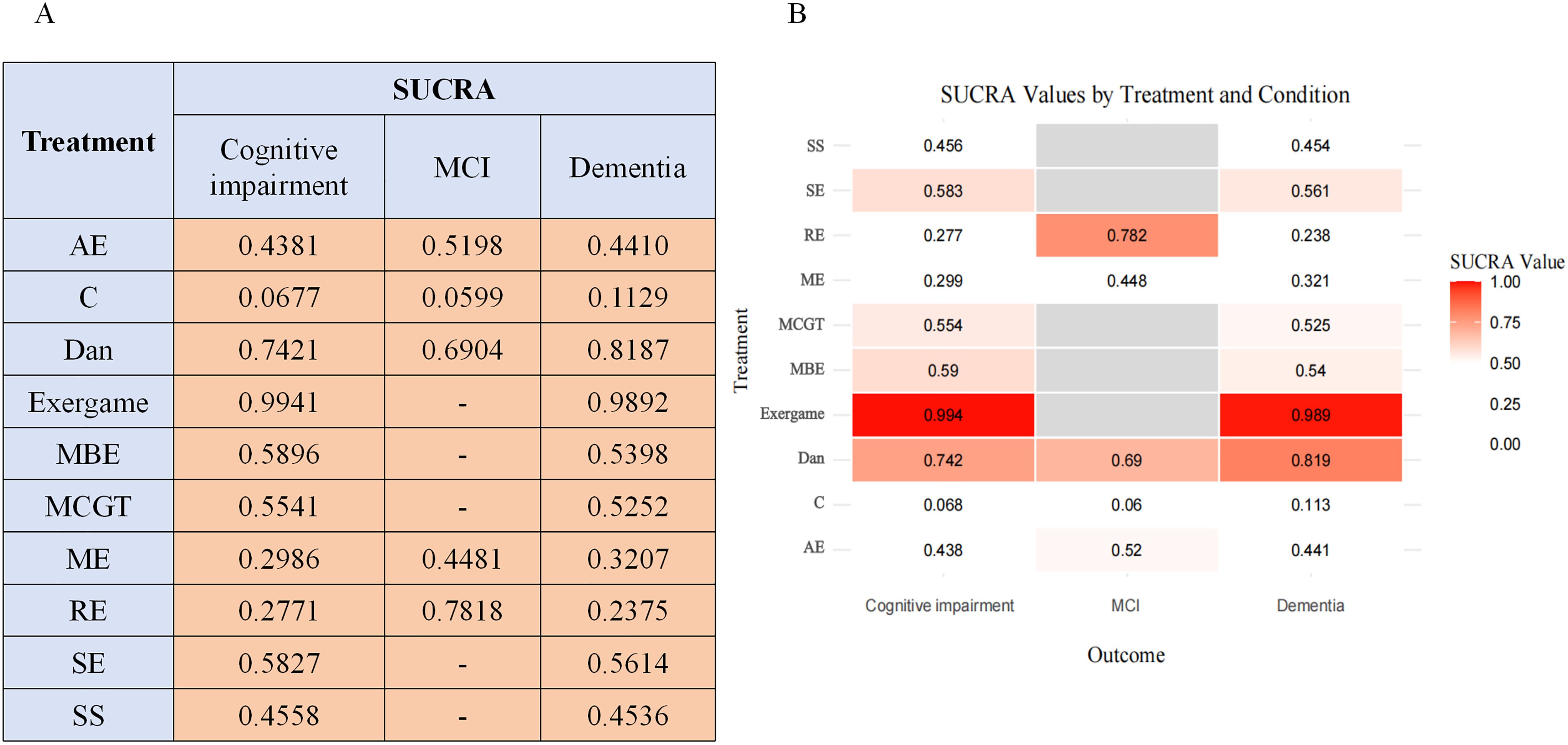 Figure 7. SUCRA probability rankings from subgroup analysis. (A) shows the SUCRA values for different treatments across cognitive subgroups (Mild Cognitive Impairment and Dementia). (B) shows a heatmap of SUCRA values for each treatment and subgroup. SUCRA values range from 0 to 1, with higher values (the closer to 1.00, the redder the color) indicating a higher ranking and a greater probability of the treatment being superior within that specific subgroup. MCI, Mild Cognitive Impairment.