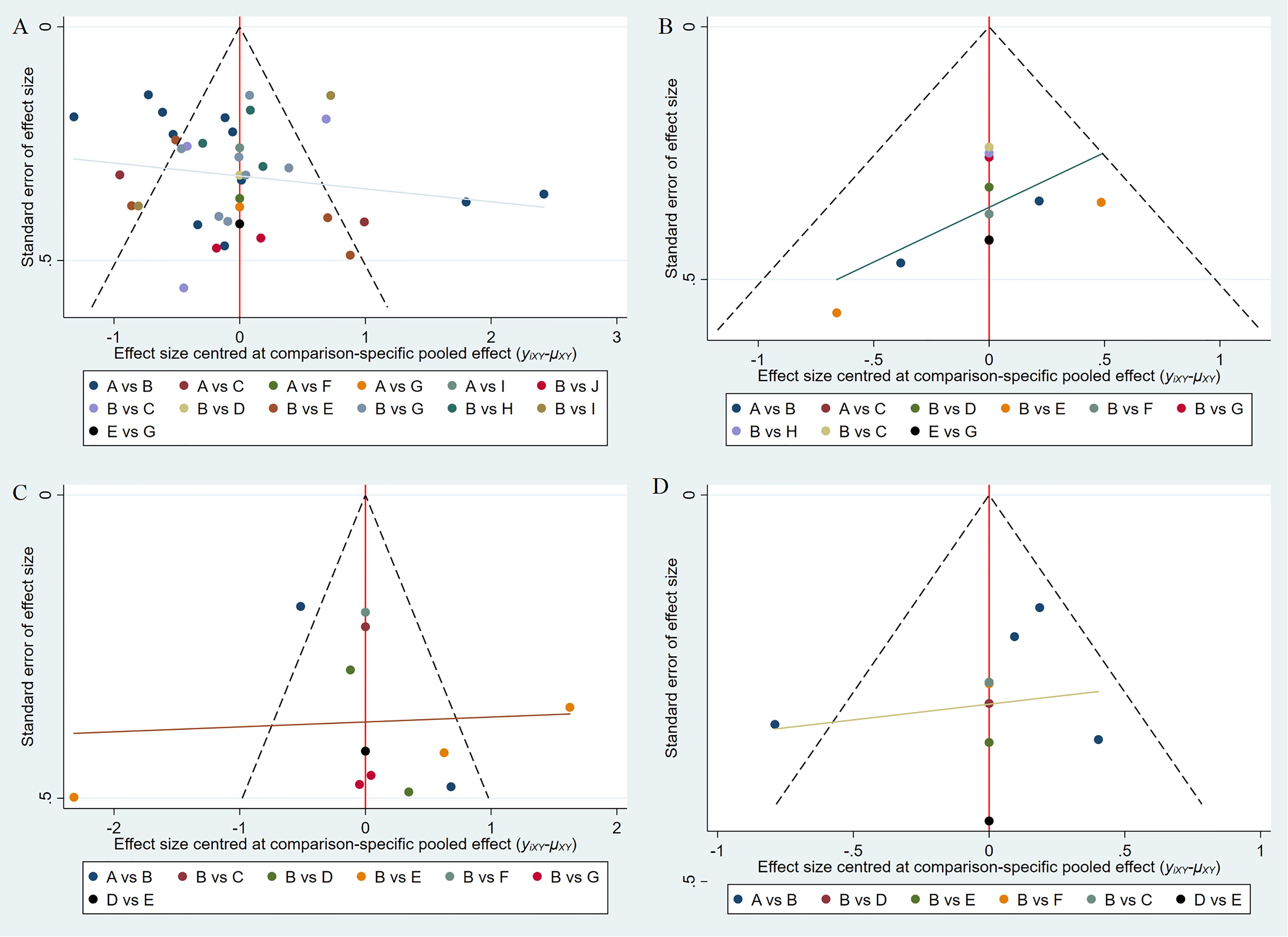 Interventions were ranked using SUCRA values, where a larger surface area indicated a greater likelihood of being the most effective option. Publication bias was assessed using comparison-adjusted funnel plots.