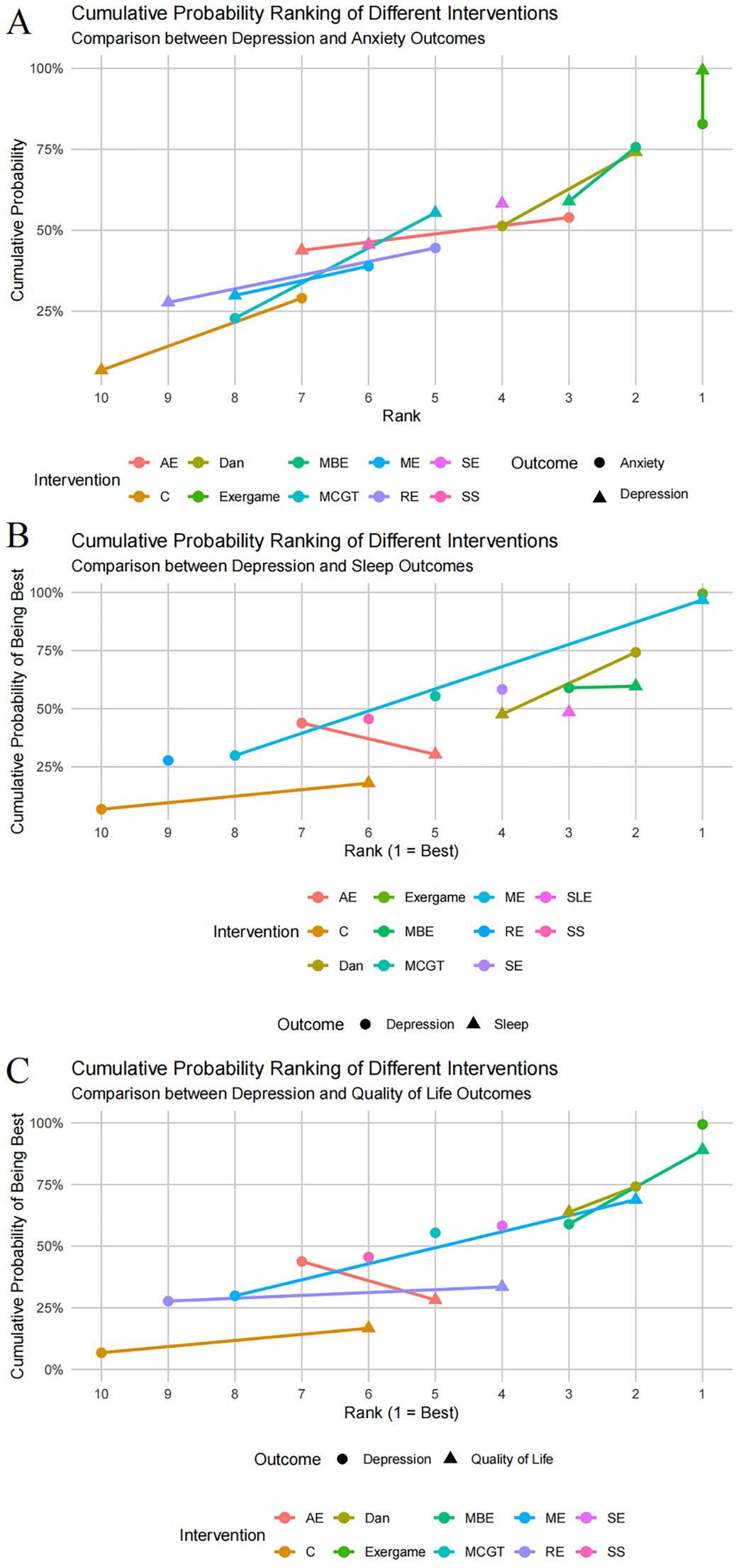 Cumulative probability rankings identified optimal intervention strategies for combined outcomes. Exergaming demonstrated superior outcomes for both depression and anxiety, suggesting potential synergistic effects. In dementia patients, exergaming retained effectiveness, though its role in dementia remains uncertain due to limited data. Dance showed promising effects for both depression and sleep in MCI populations, while ME effectively improved both depression and QoL. Different exercise modalities may exert varying therapeutic mechanisms, contributing to their differential effectiveness across symptom domains (Figure 9). SUCRA values provide quantitative rankings but depend on consistency assumptions and require cautious interpretation. Significant local inconsistencies were observed in anxiety and quality of life networks, indicating discrepancies between direct and indirect evidence. Several factors may explain these inconsistencies. First, intervention protocols varied within categories; mind-body exercise studies included Tai Chi and Qigong with different intensities, frequencies, and psychological engagement levels. Second, risk of bias assessment revealed concerns regarding randomization, blinding, and selective reporting that may have systematically affected direct comparisons. Third, the relatively sparse networks for anxiety and quality of life, with limited studies and comparison links, increased uncertainty in indirect evidence and sensitivity to individual study effects. These limitations reduce confidence in SUCRA rankings for these outcomes.