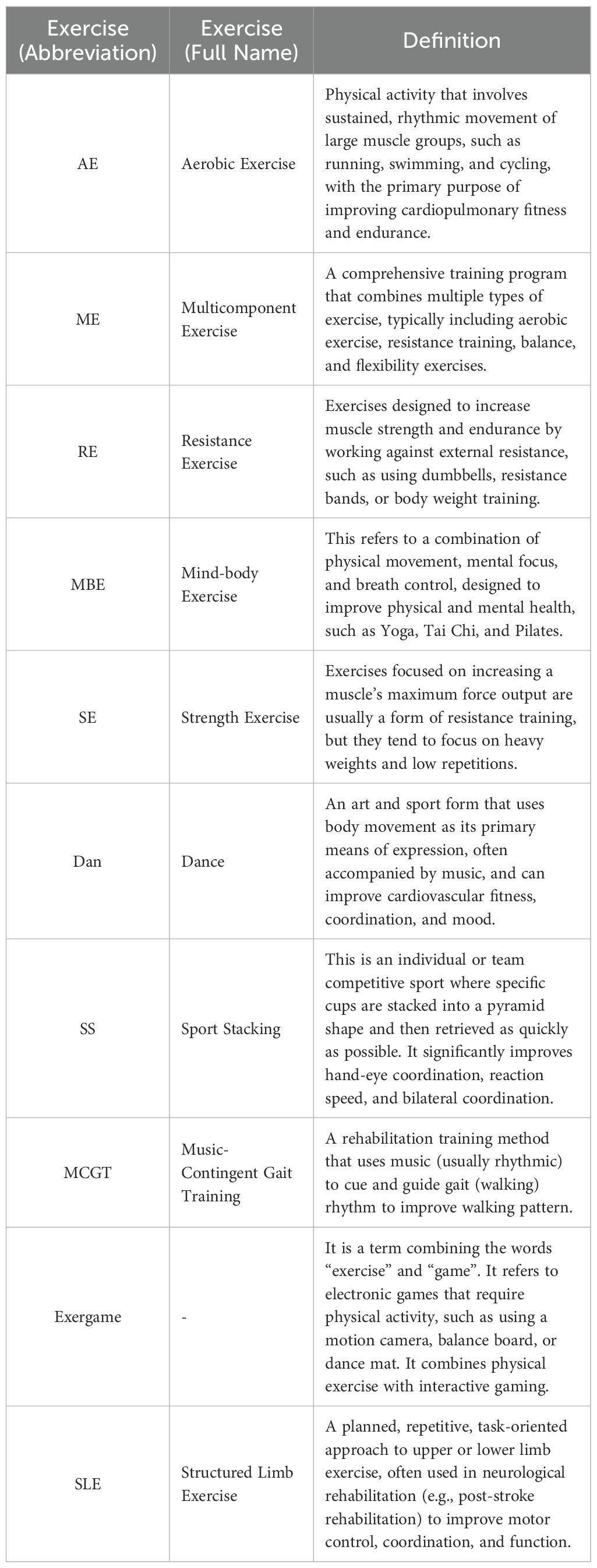 The 40 studies involved 2937 participants aged 60 to 90 years. Thirty-six studies focused on depression, 11 studies examined anxiety outcomes, 10 assessed sleep-related effects, and 9 reported QoL outcomes. Participants across the studies were diagnosed with mild cognitive impairment (MCI), dementia, Parkinson’s disease (PD), and AD (Supplementary Table S1). A total of 10 types of exercise were included (Table 1).