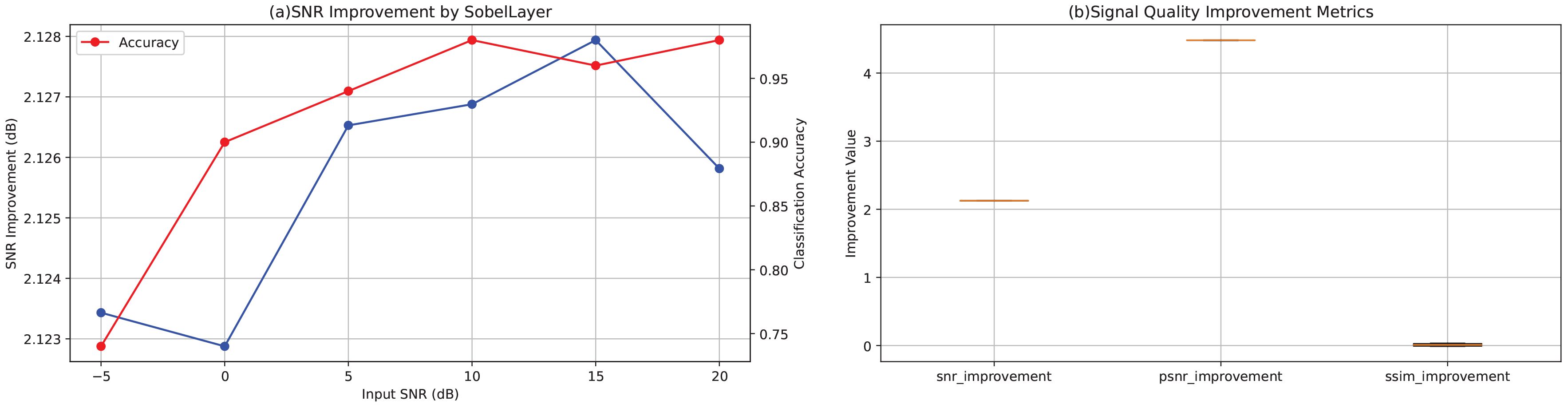 Figure 1a plots the SNR improvement conferred by the Sobel layer (blue curve) and the corresponding classification accuracy (red curve, secondary axis) as functions of input SNR, based on aggregate results from all test samples and channels. Despite a reduction in input SNR from 20 dB to −5 dB, the Sobel layer consistently yields an output SNR gain of approximately 2.12–2.13 dB—for example, an input SNR of 17.98 dB (nominally 20 dB) is raised to 20.11 dB (a = 2.13 dB), and an input SNR of −7.03 dB (nominally − dB) is elevated to − 4.91 dB (Δ ≈ 2.12 dB), demonstrating strong resilience under high-noise conditions. Classification accuracy remains relatively stable but shows a declining trend as noise increases: from 0.98 at 20 dB to 0.96 at 15 dB and 0.98 at 10 dB, then decreasing to 0.94, 0.90, and 0.74 at 5, 0, and −5 dB respectively, indicating that extreme noise still impacts classification performance.