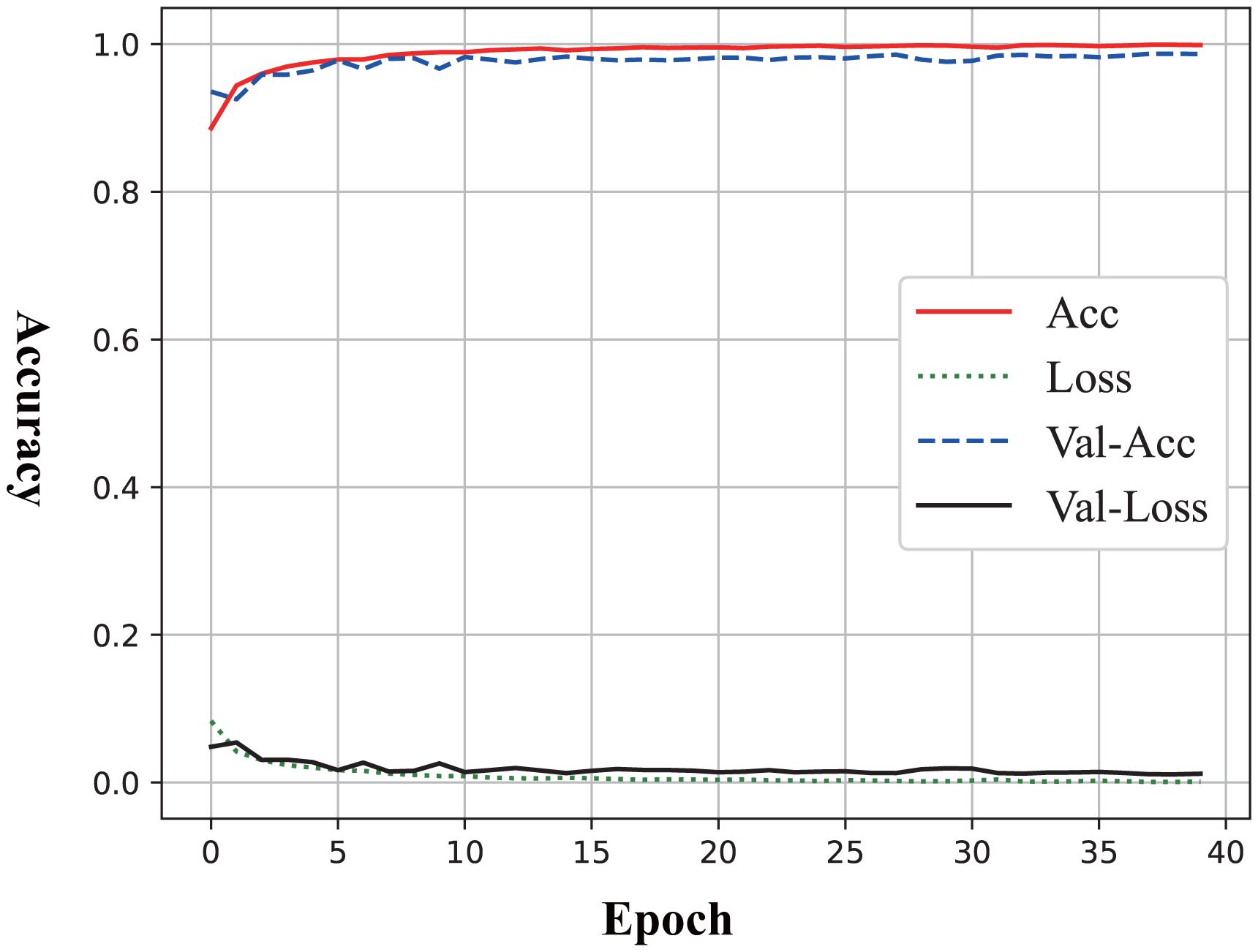 The learning curve presented in Figure 2 illustrated the performance trends of the model during the training process to identify MDD, with the x-axis representing the number of training epochs (ranging from 0 to 40) and the y-axis indicating the metric values (ranging from 0.0 to 1.0). From the curve, the overfitting and underfitting did not occur because the training accuracy and validation accuracy exhibit a “U-shaped” pattern while improving synchronously.