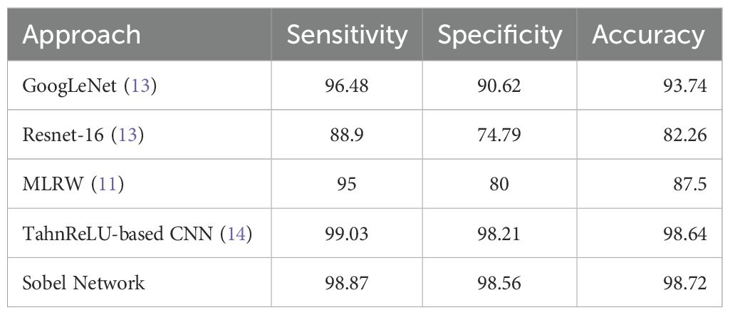 The performance is evaluated based on a series of quantitative metrics such as accuracy, sensitivity, and specificity, with comparisons between different models and existing state-of-the-art methods. The results aim to validate the effectiveness of the proposed framework in improving MDD identification accuracy, especially in capturing the subtle neurophysiological patterns associated with MDD. Table 1 compares the performance of five approaches in terms of sensitivity, specificity, and accuracy. Among them, the Sobel Network proposed in this paper ranks first with 98.56% specificity and 98.72% accuracy, while the TahnReLU-based CNN exhibits slightly superior sensitivity (99.03%). Both approaches significantly surpass other methods (e.g., GoogLeNet: 93.74% accuracy; Resnet-16: only 82.26%), indicating that the newly proposed Sobel Network demonstrates optimal comprehensive recognition capabilities—particularly excelling in positive sample detection—whereas the TahnReLU-based CNN shows marginally better robustness in discriminating negative samples. Both are suitable for high-precision scenarios. Possible reasons include the following: (1) The Sobel Network integrates traditional Sobel edge detection operators to enhance critical feature extraction, significantly improving sensitivity in identifying subtle structures (e.g., lesion boundaries in medical images), thereby optimizing positive sample detection while maintaining high specificity through end-to-end deep learning training and (2) The TahnReLU-based CNN leverages an improved activation function design (combining Tanh and ReLU), which mitigates ReLU’s neuron death issue while enhancing robustness in negative sample discrimination via Tanh’s saturation characteristics, achieving exceptional performance in balanced inter-class recognition.