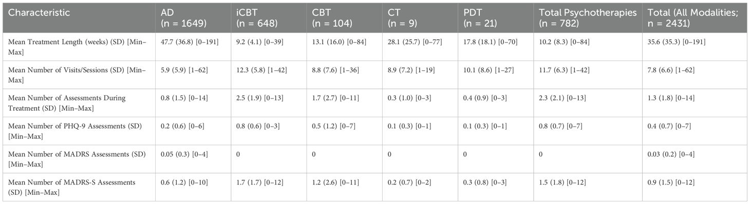 The initial dataset comprised 4105 adult patients. After applying the inclusion and exclusion criteria, the final analytic sample consisted of 2431 distinct treatment episodes involving 2173 unique patients, managed by 506 unique clinicians. Antidepressant (AD) pharmacotherapy was the most common treatment modality (n = 1649; 67.8%), while psychological treatments accounted for 782 episodes (32.2%). Among psychological treatments, iCBT was predominant (n = 648; 82.9% of psychological treatments, 26.6% of all episodes). Face-to-face cognitive behavioral therapy (CBT) accounted for 104 episodes (13.3%), while psychodynamic therapy (PDT; n = 21, 2.7%) and cognitive therapy (CT; n = 9, 1.2%) were less common.