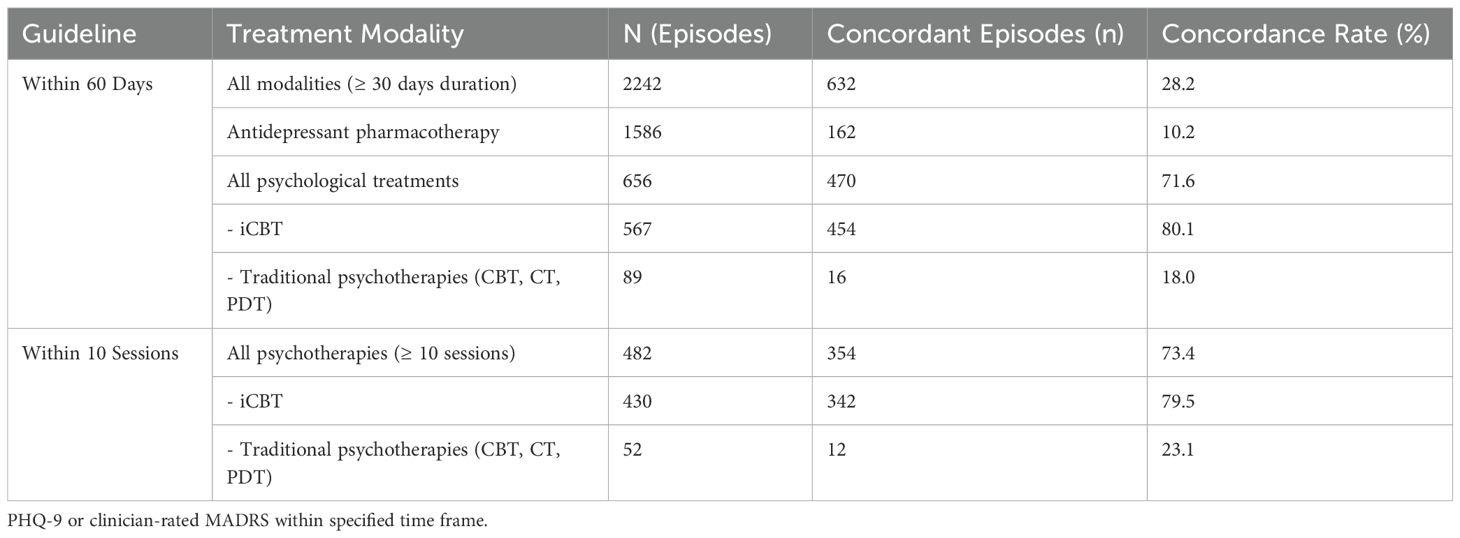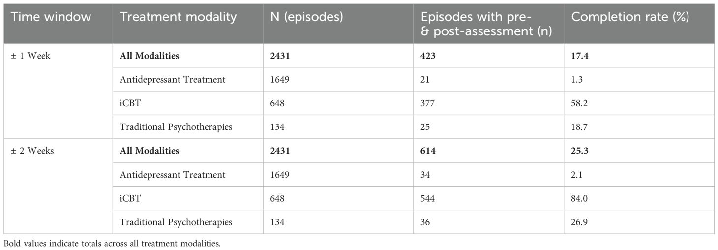 Completion rates differed sharply by treatment modality. For antidepressant management, only 21 of 1649 episodes (1.3%) met the ± 1-week criterion, rising slightly to 34 episodes (2.1%) under the ± 2-week window. In contrast, adherence was substantially higher in iCBT, with 377 of 648 episodes (58.2%) showing complete pre–post assessments within ± 1 week and 544 episodes (84.0%) within ± 2 weeks. Traditional face-to-face psychotherapies demonstrated intermediate rates, with 25 of 134 episodes (18.7%) meeting the ± 1-week criterion and 36 episodes (26.9%) the ± 2-week criterion.