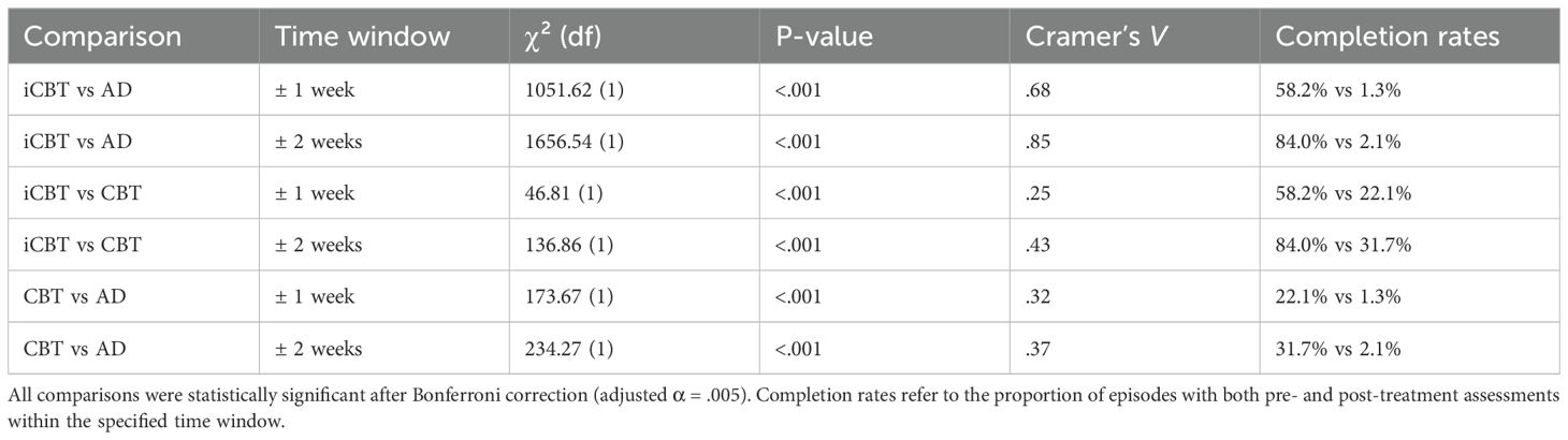 Completion rates differed significantly across treatment modalities (all p <.001), with large effect sizes (Cramer’s V = 0.66–0.83). Pairwise comparisons (Table 4B) confirmed that iCBT episodes were far more likely to include complete pre–post assessments than either antidepressant treatment or traditional psychotherapy. The magnitude of these differences was large for iCBT vs pharmacotherapy (V = 0.68–0.85) and moderate for iCBT vs face-to-face CBT (V = 0.25–0.43), underscoring the substantial advantage of digital, workflow-integrated care models. Expanding the observation window modestly improved completion in traditional psychotherapy but had minimal impact in pharmacotherapy, further highlighting structural disparities in measurement integration across care modalities.