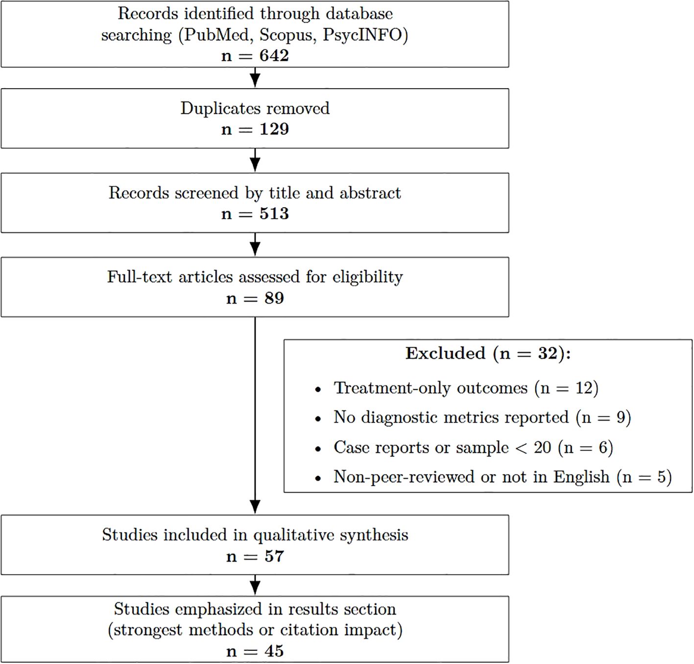 We mitigated selection bias by predefining inclusion/exclusion criteria, searching multiple databases (PubMed, Scopus, and PsycINFO; last search: 5 Aug 2025), and screening records in duplicate (two independent reviewers). We removed duplicates, recorded reasons for exclusion at full-text stage, and summarized the flow in a PRISMA diagram (Figure 1). We restricted to English language, peer-reviewed studies and did not perform a formal publication-bias analysis because no meta-analysis was conducted.