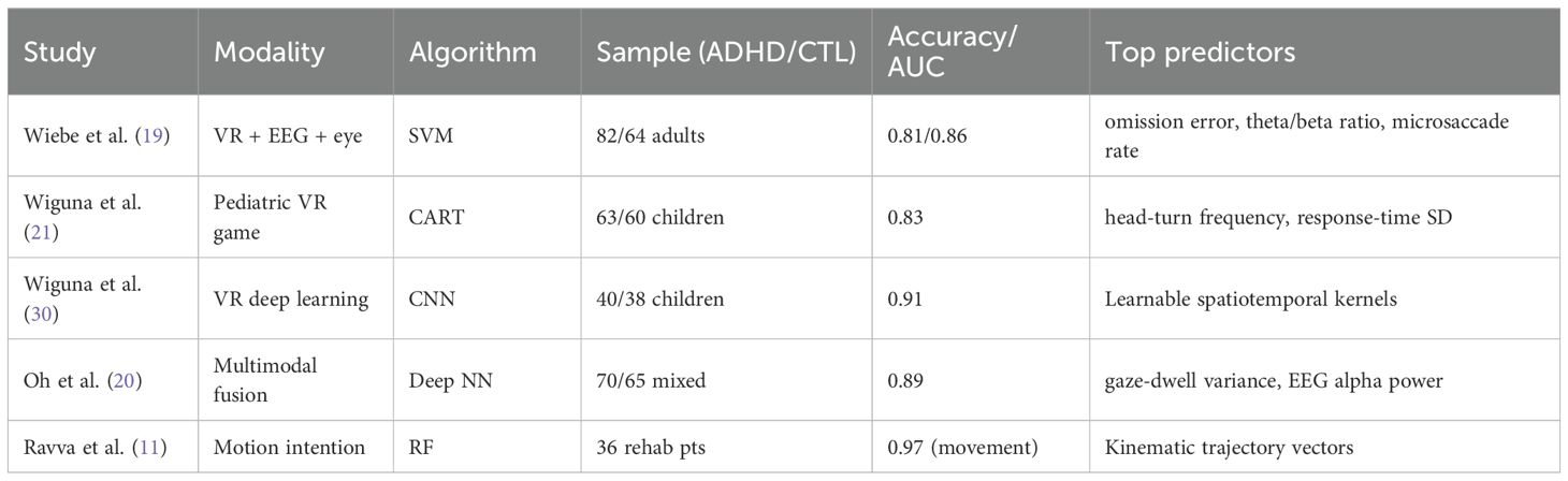 ML models then learn patterns in these rich data streams. SVM trained on behavioral and motion features have distinguished adults with ADHD from controls with about 0.81 accuracy (19). Decision-tree algorithms (CART) applied to VR classroom games have accurately classified ADHD subtypes (inattentive vs. hyperactive) with over 08.83 correctness (21). Random–forest regressors using eye–movement biomarkers in a VR “treasure-hunt” game predicted standard attention and impulsivity scale scores with moderate-to-strong correlations (r ≈ 0.43 and r ≈ 0.38 (23). CNNs processing raw VR action sequences–mapping game events directly onto DSM-5 symptom criteria– have achieved above 0.90 accuracy in children (30, 31).