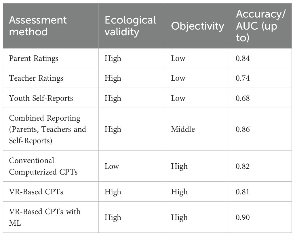 In response to these diagnostic challenges, recent technological advancements offer promising avenues. The convergence of virtual reality (VR) environments and machine learning (ML) techniques presents an opportunity to enhance both the ecological validity and objectivity of ADHD assessments. VR allows the simulation of everyday settings, such as noisy classrooms or busy office environments, within which CPT-like tasks can be embedded. These immersive scenarios are capable of eliciting more naturalistic attentional behaviors, while allowing researchers to systematically control environmental variables. Head-mounted displays (HMDs), when equipped with eye tracking modules, inertial measurement units (IMUs), and EEG interfaces, create data rich settings that support multi–modal behavioral capture. Early validation studies of VR-based platforms, such as Aula VR and Nesplora Aula, show convergence validity with standard CPTs. They also show modest improvements insensitivity and specificity (15, 17, 27). Importantly, these tools expand the scope of the evaluation to include not only attentional lapses, but also gaze patterns, postural control, and neuro-physiological reactivity.