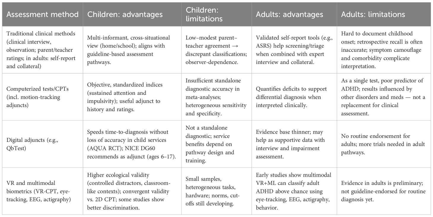 Regarding tools, computerized/CPT-style measures and digital adjuncts can add objective data but should not replace clinical assessment. In children, adding QbTest can accelerate diagnostic decision-making without loss of accuracy (AQUA RCT) and is now recommended by NICE as an adjunct for ages 6–17; evidence is insufficient for adults (37, 39). VR-based tasks increase ecological validity by controlling distractors and capturing behavior in classroom-like contexts; studies show convergent validity and improved discrimination versus some 2D CPTs in pediatric samples (18, 27). Adult work combining VR with multimodal signals (eye-tracking/EEG/actigraphy) shows preliminary classification promise but remains early-stage and requires further validation before routine use (19).
