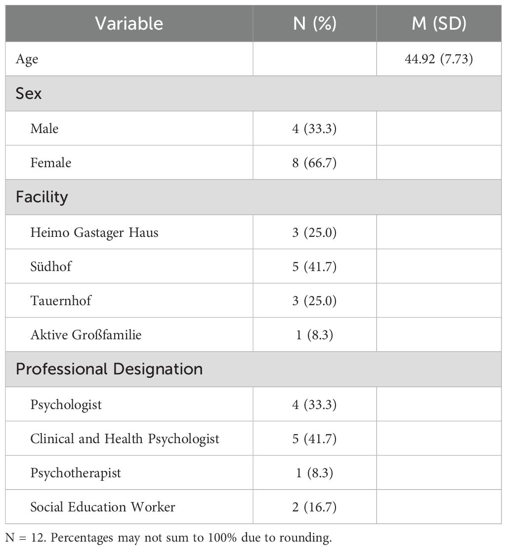 Table 1 presents the demographic characteristics of the DBT skill trainers, including their age, sex, the facility they are employed at, and their professional designation. There were twice as many female skill trainers as there were male. The Aktive Großfamilie facility had only one skill trainer available, who was supervised by a clinical health psychologist of the Heimo-Gastager-Haus.