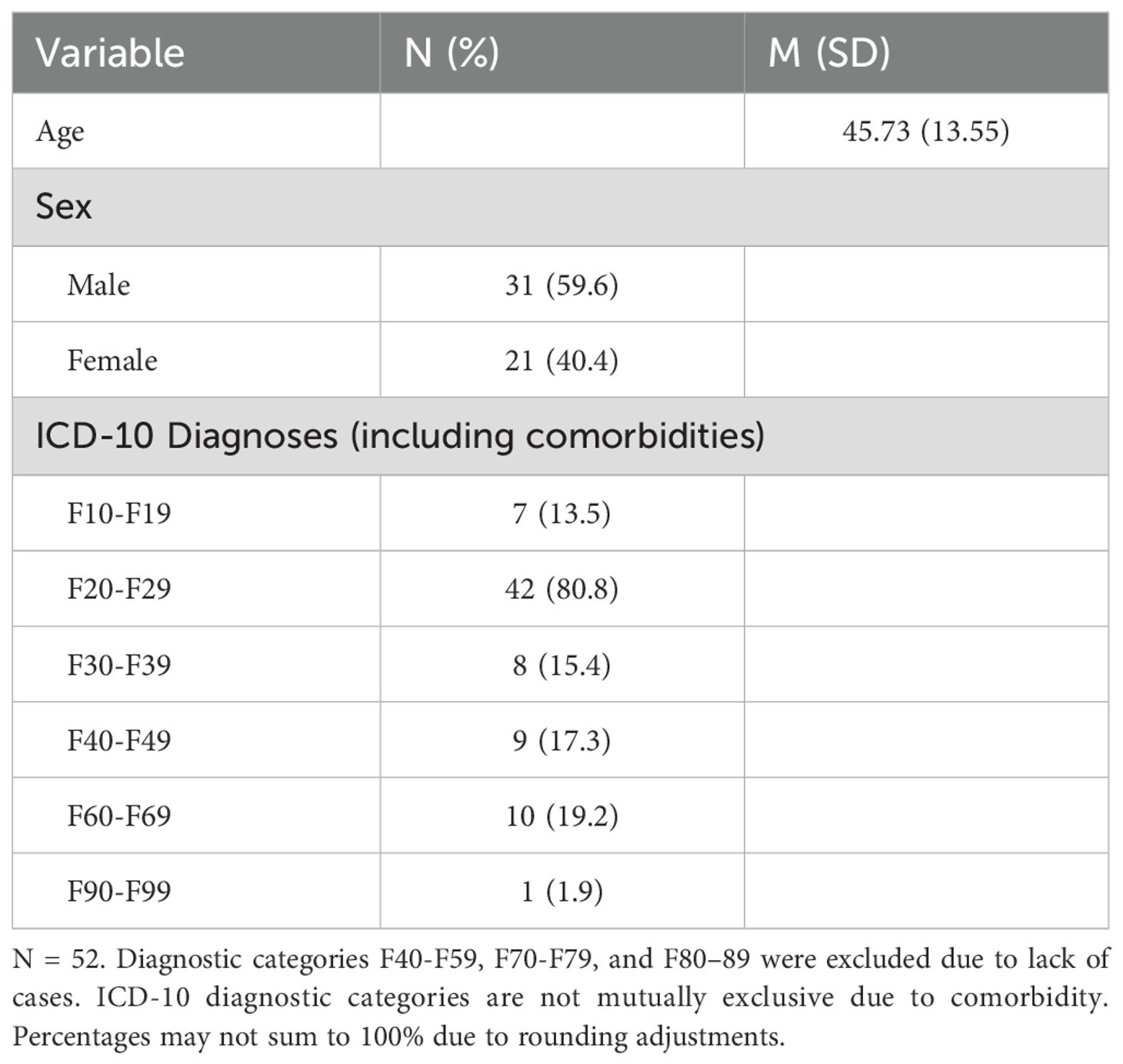 Sample demographics of the patient sample are provided in Table 2. The sample consisted of 52 participants across all four facilities. Regarding sex distribution, the sample included more male residents (59.6%) than female residents (40.4%). Participants were nearly evenly distributed across three of the four facilities (Südhof and Tauernhof: n = 16 each; Aktive Großfamilie: n = 12), while the Heimo Gastager Haus contributed fewer (n = 8). Most participants were not currently undergoing psychotherapy (59.6%) and had previous experience with DBT skills (57.7%). Two participants failed to indicate whether their prior experience. The most prevalent diagnostic category (considering all diagnoses to account for comorbidities) was F20-29 (schizophrenia spectrum disorders), comprising 80.8% of the sample. Other diagnostic categories such as F30-39 (mood disorders) and F60-F69 (personality disorders) were represented to a lesser extent.