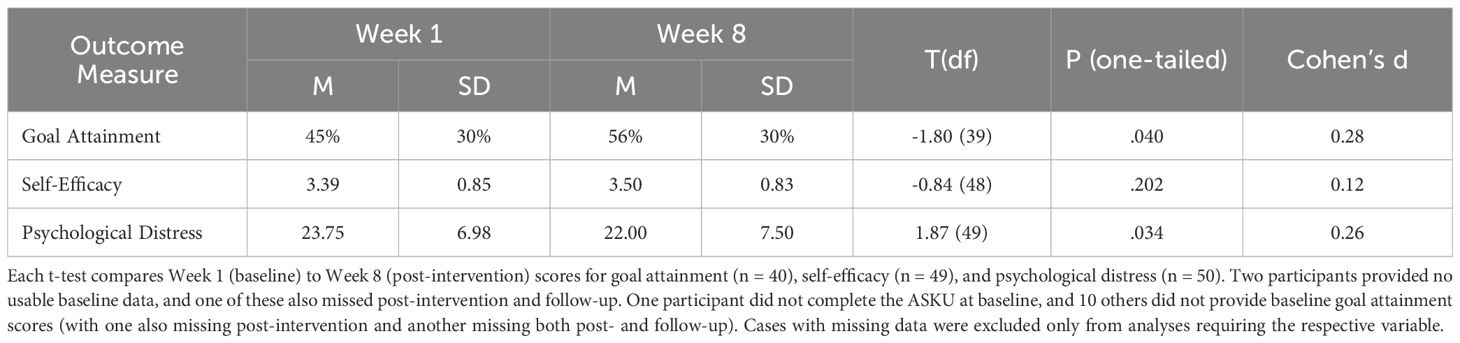 Results of the paired-samples t-tests for baseline vs. post-intervention differences are shown in Table 3. Goal attainment and psychological distress showed significant changes at α = .05, but these did not remain significant after Bonferroni correction (adjusted α = .017). Effect sizes indicated small improvements, with goal attainment increasing by 11% (d = 0.28) and distress decreasing slightly (d = 0.25).