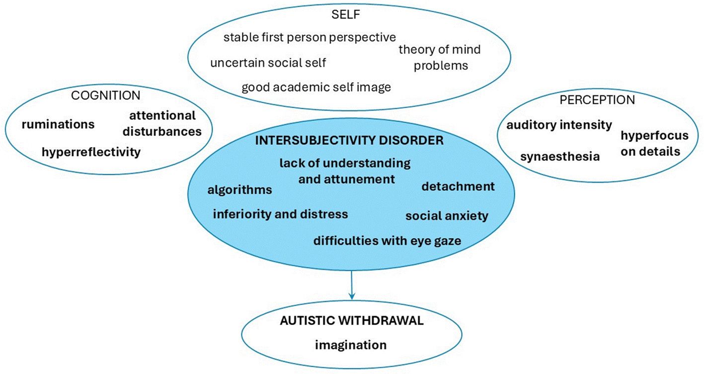Systematic clinical phenomenological studies of subjective experiences in ASD, focusing on the first-person perspective, are very limited. Most studies exploring the autistic mind focus on deficits in social cognition within neuroscience frameworks and explore symptoms and signs from a third-person perspective (34). While these theories are scientifically validated, none identify a primary psychopathological organizer explaining the logical interaction between ASD symptoms. By focusing solely on behavioral signs without inner psychopathological organizers, the definition of ASD appears overly inclusive and generic (35). Lack of research on the first-person experiential dimension in ASD makes it difficult to identify the key problem in ASD (34).