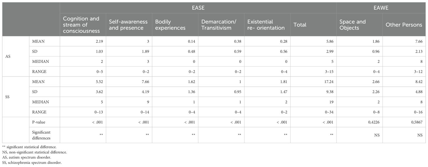 Results: Differences were observed across all five EASE domains, with higher levels in the SSD as compared to ASD in minimal self-disorder, demarcation phenomena, paranoid anxiety, short term memory disorder, and magical thinking. Meanwhile, obsessive thinking, attention problems, diminished presence in the world, social anxiety, and hyper-reflectivity overlapped in both groups. The most significant qualitative overlapping within EAWE were in abnormalities within social interactions, increased auditory perception intensity and synesthesia. Within overlaps important qualitative differences are noted and described.