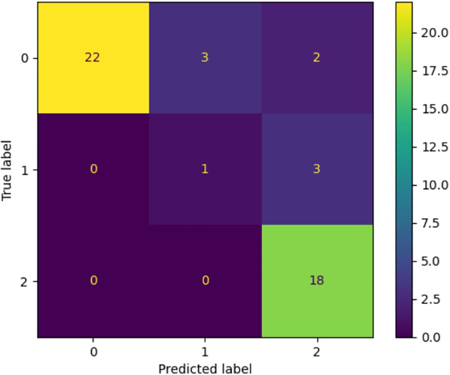 Figure 1. Confusion matrix with the performance of the Random Forest model on the external dataset. The model is very strong in the classification of normal and clinical classes and low in the classification of the borderline one, with many false classifications in the nearest categories. The trend can be attributed to the fact that there is a natural overlap of the class lines and a lack of representation of the borderline cases in training.