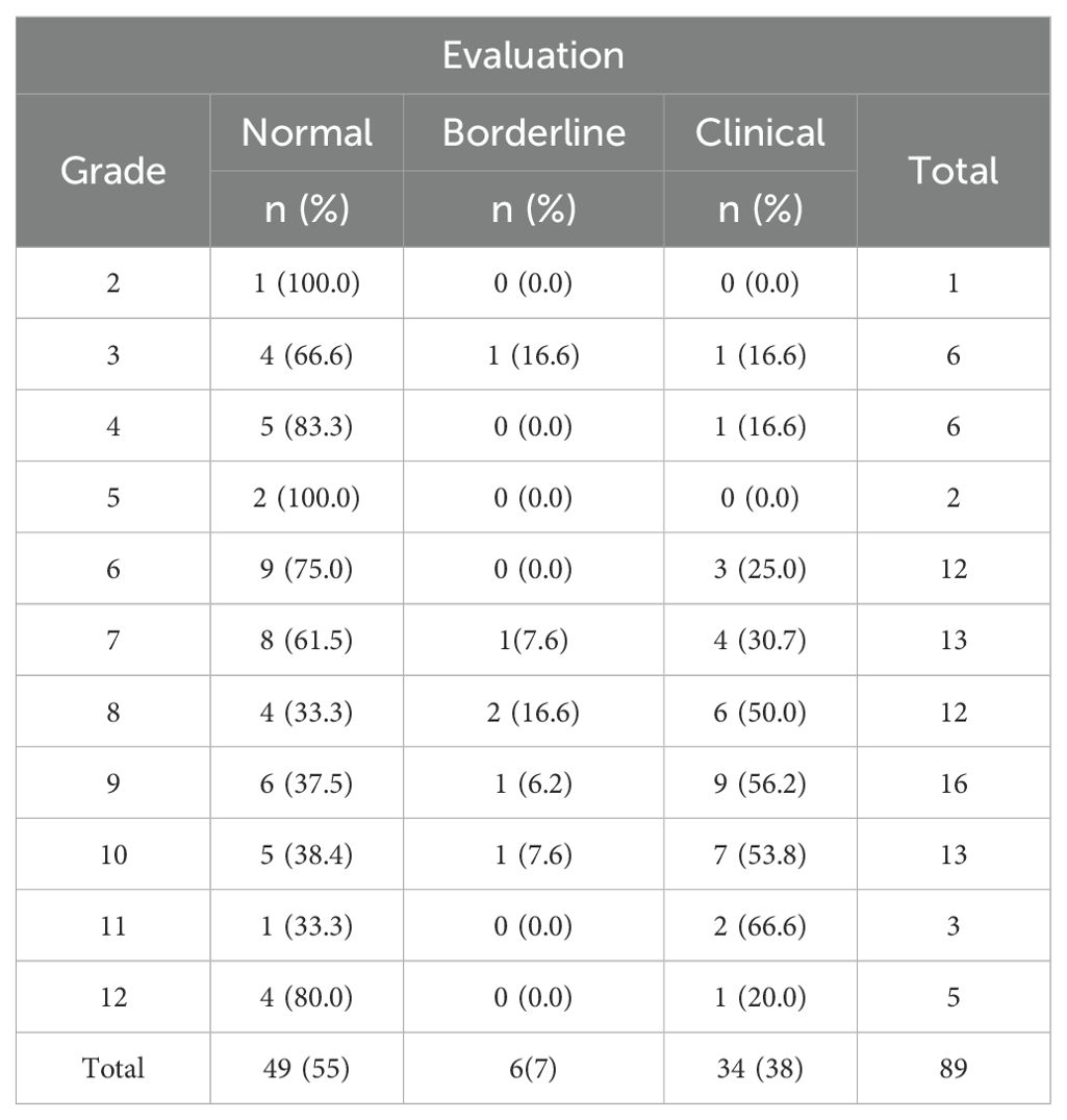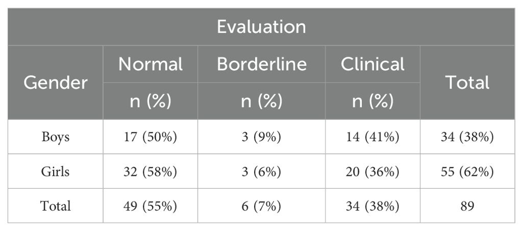 Missing data was found for 12 individuals in the ‘Sex’ variable and 46 individuals in the ‘Grades’ variable. Since these two are important variables for RCADS T score evaluation, any case that lacked either of these information was discarded. Instances with even one missing value were deleted, leaving 89 instances, 34 boys (38%) and 55 girls (62%). In order to evaluate the possibility of bias due to missing cases, total RCADS raw scores, were compared between retained (n = 89) and dropped (n = 49) participants. There was no significant difference (t-statistics = -0.039, p-value = 0.968), which means that the cases that were excluded had the same level of symptoms as the research sample and that the missing cases were not likely to create systematic bias. As per RCADS scoring criteria, a total score of less than 65 was categorized as Normal, a score between 65 and 69 as Borderline, and a score of 70 or more as Clinical. In the remaining dataset of 89 individuals, there were 49 normal cases (55%), 6 borderline cases (7%), and 34 clinical cases (38%). Among the 34 boys, 17 were classified as normal (50%), 3 as borderline (9%), and 14 as clinical (41%). Tables 1, 2 show the detailed distribution of the instances.