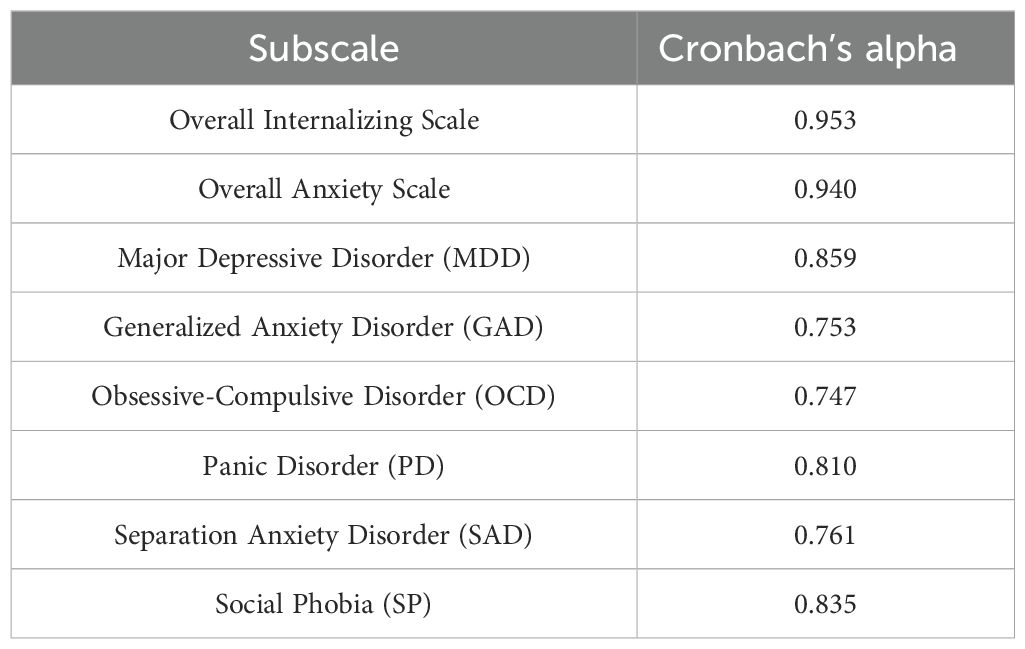 In line with the published studies, each subscale’s internal consistency was measured using Cronbach alpha to see how closely connected the RCADS items were to one another. Cronbach’s alpha (α) quantifies the reliability of a score by calculating the inter-item correlations among all items and the magnitude of Cronbach’s alpha to summarize the information of questionnaire items (39). Alpha values of 0.70 or higher were considered acceptable. The 47 items of the RCADS are divided into 6 subscales, however, since the study focuses on evaluating the internalizing scale, the computation was limited to this scale only. None of the following steps made use of the evaluations from the other subscales.