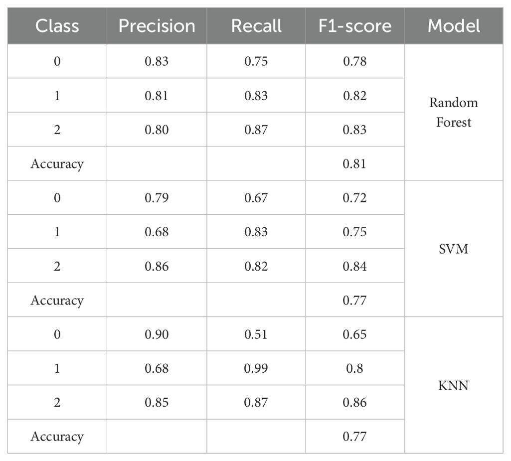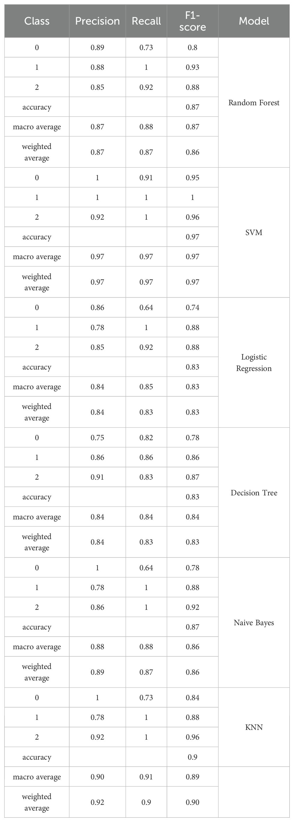 The Random Forest-Recursive Feature Elimination (RF-RFE) algorithm was used for the identification of significant features to be used during machine learning as Random Forest, a multiclass algorithm, has an intrinsic unbiased feature significance metric (41). Initially, SVM was used for RFE, however, SVM’s capacity to find strong predictors is impacted by the presence of correlated predictors, even if it supports non-linear connections between predictors. The Random Forest-Recursive Feature Elimination (RF-RFE) method is one proposed solution. Similar applications of the RFE technique to Random Forests have shown that it works well when correlated features are present (42). In this study, a specific number of features to be selected was not provided; instead, the model determined it automatically.