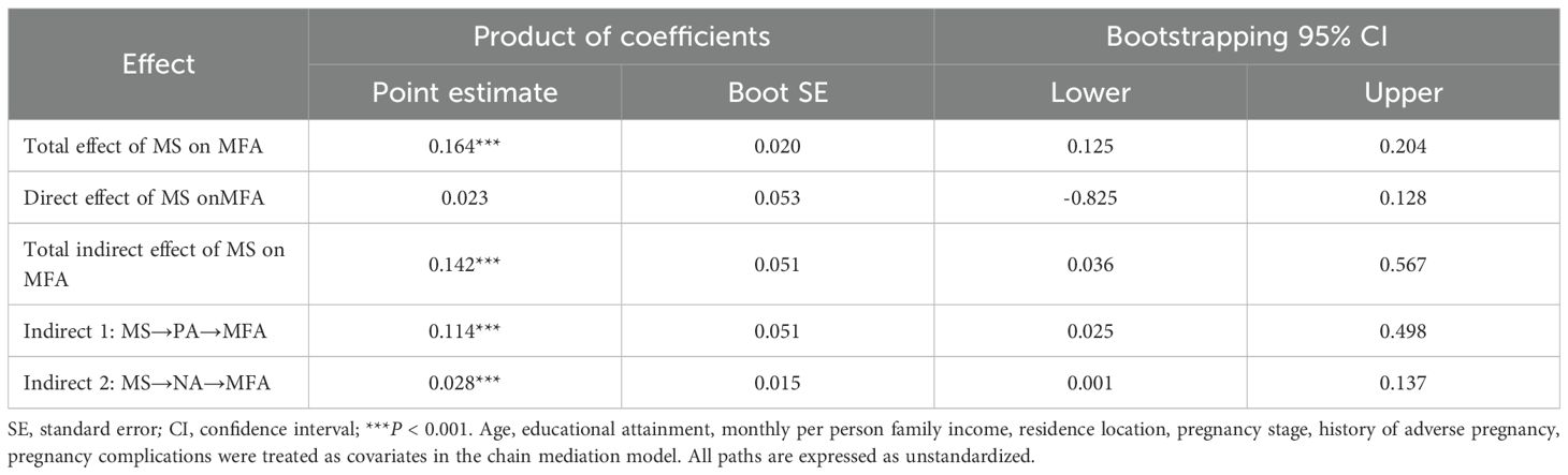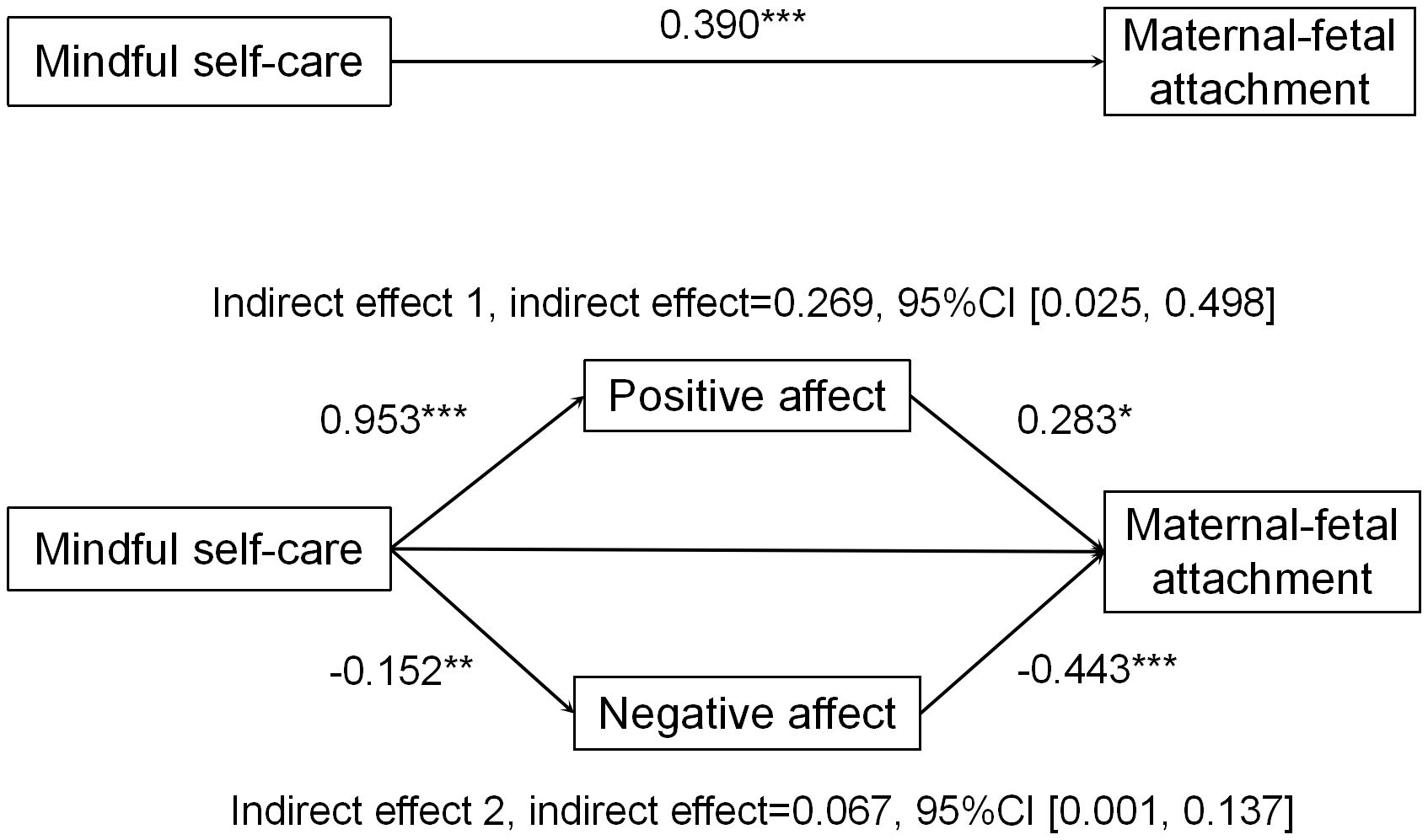 Conclusion: Positive and negative affect play parallel mediating roles in the relationship between mindful self-care and MFA, emphasizing the critical role of emotion regulation in developing prenatal MFA and underscore the important value of mindful self-care as a psychological resource during pregnancy, which provides new perspectives for future theoretical models and intervention designs.
