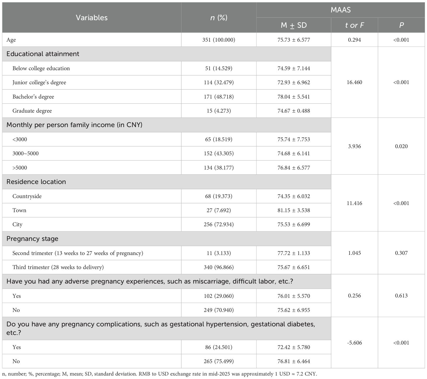The mean age of 351 pregnant women recruited was (30.98 ± 4.027). In the present study, most of the participants had a bachelor’s degree (48.718%), monthly per capita household income was 3000–5000 RMB (43.305%), lived in cities (72.934%), were in the third trimester of pregnancy (96.866%), did not have a history of adverse pregnancy (70.940%), and did not have complications during pregnancy (75.499%). Among the socio-demographic characteristics, participants’ varying age, educational attainment, per person monthly family income, residence location, and pregnancy complications had an impact on MAAS scores. See Table 1 for details.