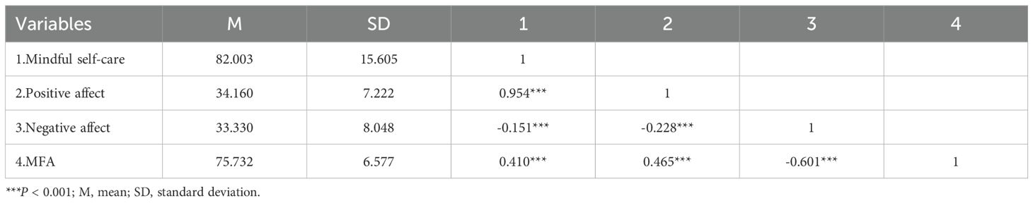 Table 2 provided the means, standard deviations, and correlations among the variables. The results showed that mindful self-care was positively correlated with positive affect (r = 0.954, P < 0.001) and MFA (r = 0.410, P < 0.001), and negatively correlated with negative affect (r = -0.151, P < 0.001). Positive affect was negatively correlated with negative affect (r = -0.228, P < 0.001) and positively correlated with MFA (r = 0.465, P < 0.001). Negative affect was negatively correlated with MFA (r = -0.601, P < 0.001). See Figure 2 for the correlation heatmap.