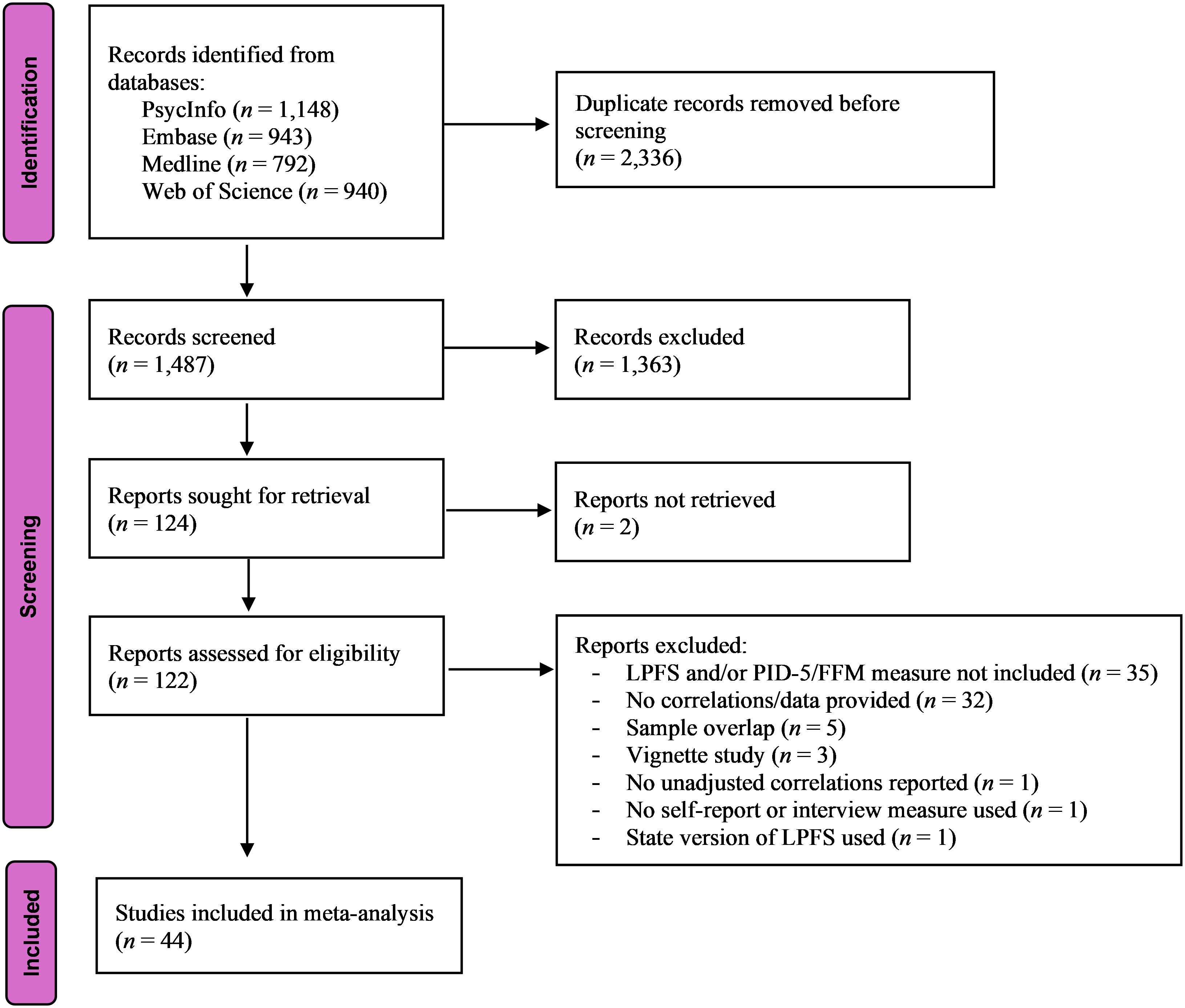 This study was pre-registered on the Open Science Framework (OSF) on March 3, 2024 (https://osf.io/49rs7). A literature search was conducted on December 2, 2024, in the databases PsycINFO, Medline, Embase, and Web of Science for studies published since 2011 (the year of the publication of the LPFS). To minimize the risk of missing relevant studies, the broad search string “personality functioning” OR “personality dysfunction” OR “personality impairment” was used. The search results from the four databases were downloaded into Zotero and processed further in this reference management software. Following the removal of duplicates, the studies’ titles, abstracts, language, and publication types were screened for possible inclusion in the meta-analysis. The full texts of the remaining studies were sought through the institutional library or by contacting the authors. The available full-texts were then assessed independently by the author and a research assistant for the following inclusion criteria, as specified in the pre-registered protocol: 1) the cross-sectional correlations of the LPFS total score, self and interpersonal functioning, and/or the identity, self-direction, empathy, and intimacy elements with the DSM-5 pathological personality trait domains or facets and/or the Five-Factor Model personality dimensions are reported; alternatively, data are provided to make it possible to calculate these correlations; 2) the DSM-5 pathological personality traits were assessed using a version of the PID-5 (15); 3) an adult sample (defined as mean age of 18 years and above) was used; 4) the study was published in a peer-reviewed journal; and 5) the language of the publication was English, German, or a Scandinavian language. Consistent with the protocol, the following exclusion criteria were applied: 1) personality functioning was not assessed in accordance with the LPFS; 2) an instrument other than a version of the PID-5 was used to assess the DSM-5 pathological personality traits; 3) adolescent samples; 4) review papers, case studies, vignette studies, and qualitative studies; and 5) unavailable publication. When reviewing the full-text studies, it became clear that the inclusion and exclusion criteria needed to be extended and refined, and the following exclusion criteria were added: 6) measurement of the LPFS with a method other than clinical assessment, interview, or self-report; 7) sample overlap with a previous study; 8) reporting adjusted correlations; and 9) using state measurement of personality functioning.