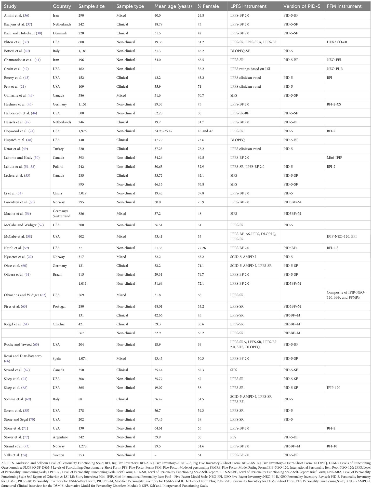 Beyond the bivariate correlations between the measures of the LPFS and the DSM-5 and FFM personality traits, study characteristics were extracted from the included publications, i.e., the publication year, country, sample size, sample type (non-clinical, clinical, or mixed), mean age, percentage of female participants, and the instruments used to assess the LPFS, DSM-5 pathological personality traits, and the FFM personality traits. A sample was classified as clinical when participants were recruited at a clinic or hospital or reported being currently in treatment for mental health problems. A research assistant checked a random selection of approximately 20% of the data for the correct extraction from the publications.