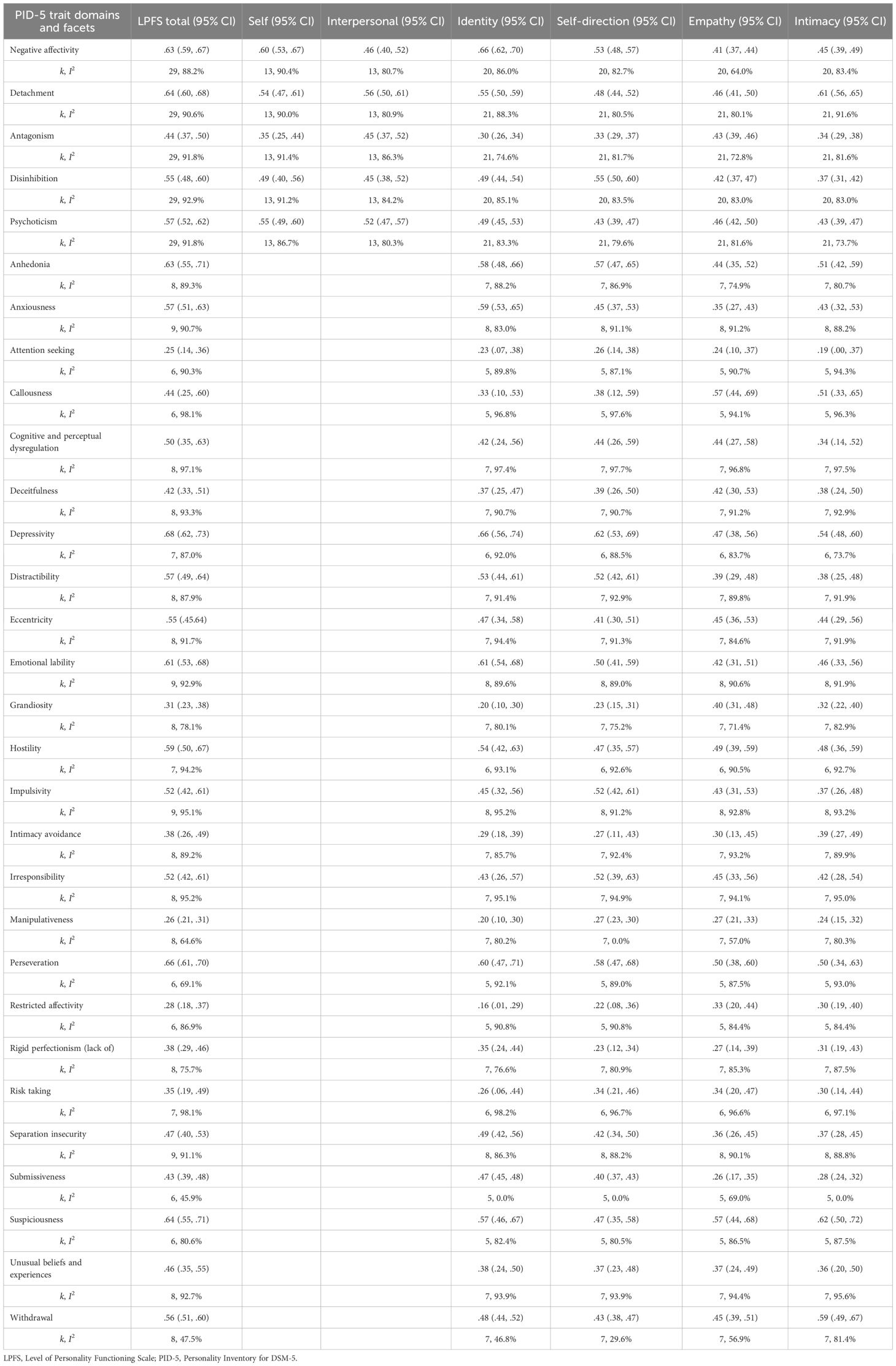 The measures of LPFS identity were most strongly correlated with the PID-5 trait domains of negative affectivity and detachment, with large effect sizes. Concerning the PID-5 trait facets, large-sized average correlations were found with (in descending order of their size) depressivity, emotional lability, perseveration, anxiousness, anhedonia, suspiciousness, hostility, and distractibility. LPFS self-direction measures showed the highest pooled correlations with the PID-5 trait domains disinhibition and negative affectivity and the trait facets depressivity, perseveration, anhedonia, distractibility, impulsivity, irresponsibility, and emotional lability, with large effect sizes. The average correlations between LPFS empathy scales and the PID-5 trait domains showed little variation and ranged from .41 (negative affectivity) to .46 (psychoticism). On the trait facet level, LPFS empathy scales were most strongly correlated with callousness, suspiciousness, and perseveration (all three correlations were .50 or above). For the measures of LPFS intimacy, pooled large-sized correlations were found with the PID-5 trait domain detachment and the trait facets of suspiciousness, withdrawal, depressivity, callousness, anhedonia, and perseveration.