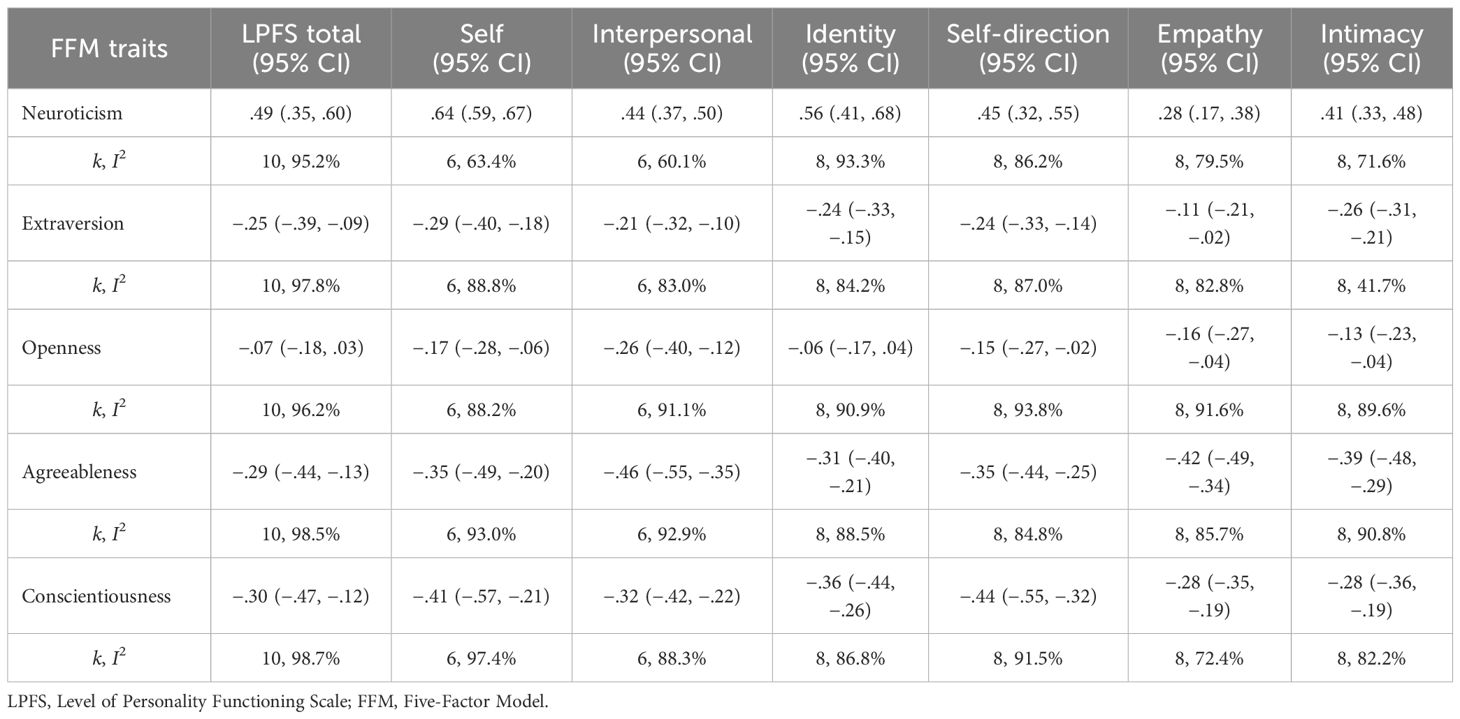 The current investigation has limitations that must be taken into consideration when interpreting its results. First, the study examined the bivariate associations between the LPFS and the PID-5 personality traits. However, to estimate the overall associations between the LPFS and pathological personality traits, multivariate analyses are needed. For example, predicting the LPFS total score from all PID-5 trait domains provides an estimate of the proportion of variance in the LPFS that the trait domains explain combined and information about the unique contributions of the individual traits by controlling for the intercorrelations between the PID-5 traits (15). Next, the LPFS was assessed using a variety of instruments, which may have increased the heterogeneity between studies. More importantly, factorial evaluations of some multidimensional LPFS measures have found problems with the proposed internal structures, i.e., the distinction between self and interpersonal functioning and between the identity, self-direction, empathy, and intimacy elements (56, 68, 94). Further, a lack of discriminant validity of scales designed to assess the LPFS has been found (23, 58). The precision of the effect size estimates obtained in a meta-analysis is naturally affected by the number of studies included in the analysis. While there was a moderate number of data publicly available on the associations between the LPFS and the PID-5 trait domains, few studies have investigated the PID-5 trait facets and the FFM traits, resulting in large confidence intervals in the results of the meta-analyses. In addition, the limited number of studies reduced the statistical power to detect moderators of the observed associations. Finally, most studies included in this meta-analysis used non-clinical samples composed primarily of female young adults and were conducted in Western countries. However, the usefulness and applicability of the DSM-5 AMPD across different sociocultural contexts are unclear (95). Thus, the generalizability of the study’s findings to clinical samples and to more diverse populations in terms of age, gender, and culture is uncertain.