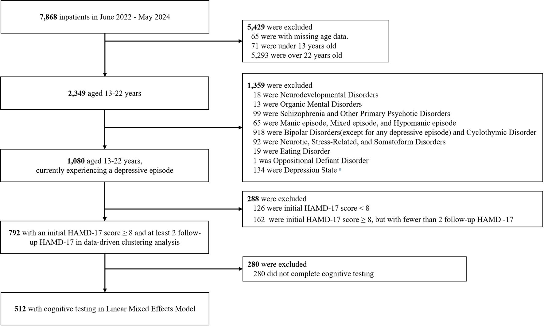 Flowchart illustrating the patient selection process for cognitive testing from June 2022 to May 2024. Out of 7,868 inpatients, 5,429 were excluded due to age criteria. Among 2,349 patients aged 13-22, 1,359 were excluded based on other disorders. From 1,080 experiencing a depressive episode, 288 were excluded for HAMD-17 criteria. Out of 792, 280 were excluded for not completing cognitive testing, leaving 512 for analysis.