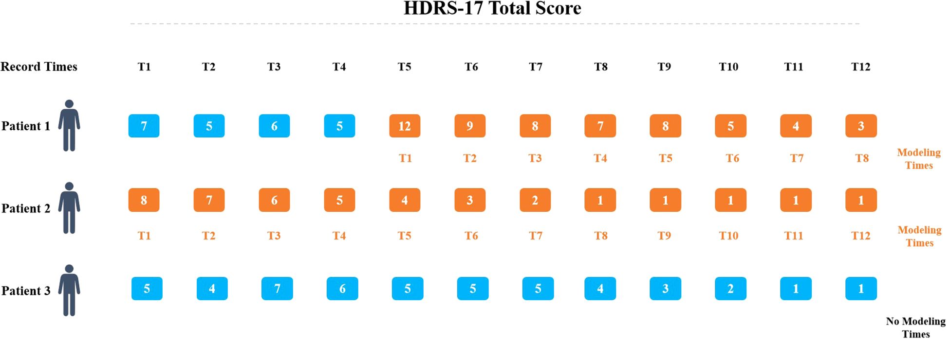 HDRS-17 Total Score chart showing scores for three patients across twelve time points. Patient 1 scores range from 5 to 12, Patient 2 from 1 to 8, Patient 3 from 1 to 7. Scores at specific times, marked in blue and orange, indicate modeling and non-modeling times.